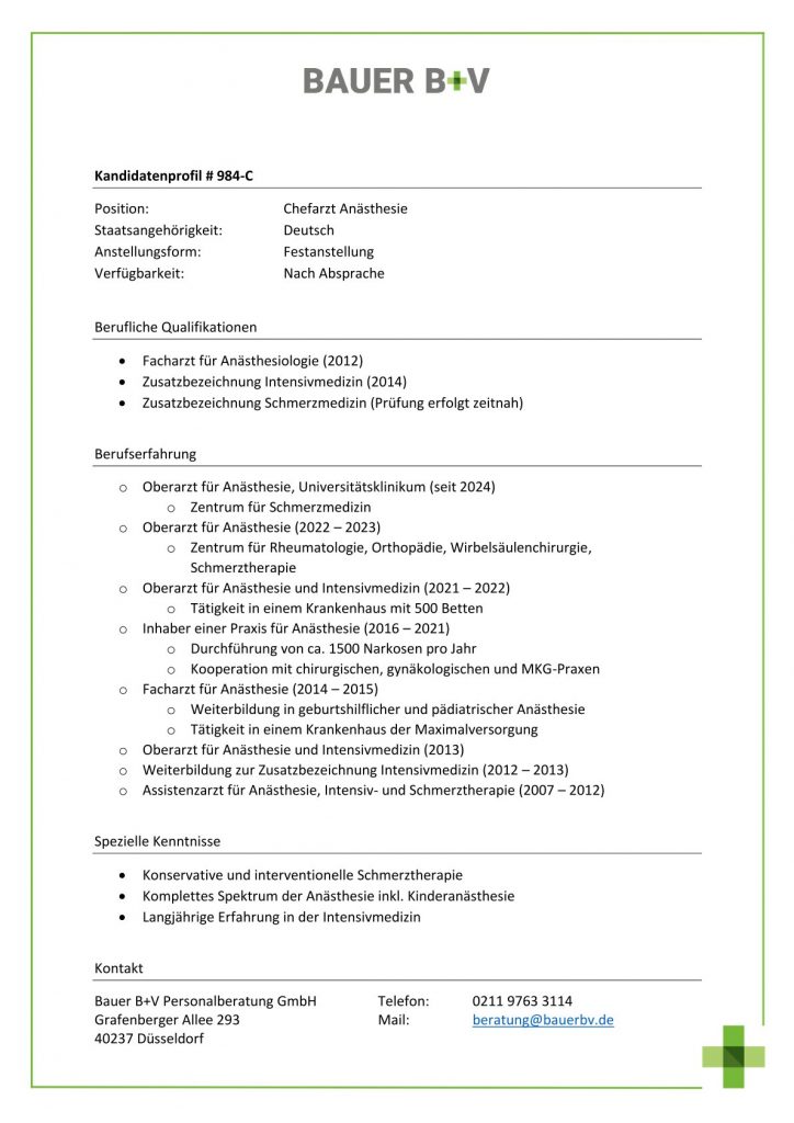Download - Chefarzt Anästhesie [# 984-C] Facharzt für Anästhesiologie Zusatzbezeichnung Intensivmedizin Zusatzbezeichnung Schmerzmedizin Oberarzt für Anästhesie Universitätsklinikum Zentrum für Schmerzmedizin Oberarzt für Anästhesie Zentrum für Rheumatologie Orthopädie Wirbelsäulenchirurgie Schmerztherapie Oberarzt für Anästhesie Intensivmedizin Tätigkeit Krankenhaus Betten Inhaber Praxis für Anästhesie Durchführung Narkosen pro Jahr Kooperation chirurgischen gynäkologischen MKGPraxen Facharzt für Anästhesie Weiterbildung geburtshilflicher pädiatrischer Anästhesie Tätigkeit Krankenhaus Maximalversorgung Oberarzt für Anästhesie Intensivmedizin Weiterbildung Zusatzbezeichnung Intensivmedizin Assistenzarzt für Anästhesie Intensiv Schmerztherapie Konservative interventionelle Schmerztherapie Komplettes Spektrum Anästhesie Kinderanästhesie Langjährige Erfahrung Intensivmedizin