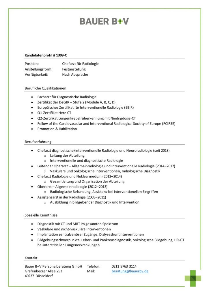 Download - Chefarzt für Radiologie [# 1309-C] Facharzt für Diagnostische Radiologie Zertifikat der DeGIR Stufe Module A B C D Europäisches Zertifikat für Interventionelle Radiologie EBIR QZertifikat HerzCT QZertifikat Lungenkrebsfrüherkennung mit NiedrigdosisCT Fellow of the the Cardiovascular and Interventional Radiological Society of Europe FCIRSE Promotion Habilitation Chefarzt diagnostische interventionelle Radiologie Neuroradiologie seit Leitung der Abteilung Interventionelle diagnostische Radiologie Leitender Oberarzt Allgemeinradiologie Interventionelle Radiologie Vaskuläre onkologische Interventionen radiologische Diagnostik Chefarzt Radiologie Nuklearmedizin Gesamtleitung Organisation der Abteilung Oberarzt Allgemeinradiologie Radiologische Befundung Assistenz bei interventionellen Eingriffen Assistenzarzt in der Radiologie Ausbildung in bildgebender Diagnostik Intervention Diagnostik mit CT MRT im gesamten Spektrum Vaskuläre nichtvaskuläre Interventionen Implantation zentralvenöser Zugänge Dialyseshuntinterventionen Bildgebungsschwerpunkte Leber Pankreasdiagnostik onkologische Bildgebung HRCT bei interstitiellen Lungenerkrankungen