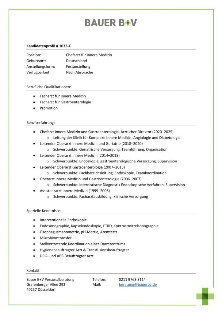 Download - Chefarzt Gastroenterologie [# 1033-C] Facharzt für Innere Medizin Facharzt für Gastroenterologie Promotion Chefarzt Innere Medizin und Gastroenterologie Ärztlicher Direktor Leitung der Klinik für Komplexe Innere Medizin Angiologie und Diabetologie Leitender Oberarzt Innere Medizin und Geriatrie Schwerpunkte Geriatrische Versorgung Teamführung Organisation Leitender Oberarzt Innere Medizin Schwerpunkte Endoskopie gastroenterologische Versorgung Supervision Leitender Oberarzt Gastroenterologie Schwerpunkte Fachbereichsleitung Endoskopie Teamkoordination Oberarzt Innere Medizin und Gastroenterologie Schwerpunkte internistische Diagnostik Endoskopische Verfahren Supervision Assistenzarzt Innere Medizin Schwerpunkte Facharztausbildung klinische Versorgung Interventionelle Endoskopie Endosonographie Kapselendoskopie FTRD Kontrastmittelsonographie Ösophagusmanometrie pH Metrie Atemtests Mikrobiomtransfer Stellvertretende Koordination eines Darmzentrums Hygienebeauftragter Arzt Transfusionsbeauftragter DRG und ABS Beauftragter Arzt