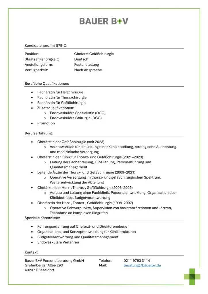 Download - Chefarzt Gefäßchirurgie [# 879-C] Fachärztin für Herzchirurgie Fachärztin für Thoraxchirurgie Fachärztin für Gefäßchirurgie Endovaskuläre Spezialistin DGG Endovaskuläre Chirurgin DGG Promotion Chefärztin der Gefäßchirurgie Verantwortlich für die Leitung einer Klinikabteilung strategische Ausrichtung und medizinische Versorgung Chefärztin der Klinik für Thorax und Gefäßchirurgie Leitung der Fachabteilung OP Planung Personalführung und Qualitätsmanagement Leitende Ärztin der Thorax und Gefäßchirurgie Operative Versorgung im thorax und gefäßchirurgischen Spektrum Weiterentwicklung der Abteilung Chefärztin der Herz Thorax Gefäßchirurgie Aufbau und Leitung einer Fachklinik Personalentwicklung Organisation des Klinikbetriebs Budgetverantwortung Oberärztin der Herz Thorax Gefäßchirurgie Operative Schwerpunkte Supervision von Assistenzärztinnen und ärzten Teilnahme an komplexen Eingriffen Führungserfahrung auf Chefarzt und Direktorenebene Organisations und Konzeptentwicklung für Klinikstrukturen Budgetverantwortung und Qualitätsmanagement Endovaskuläre Verfahren