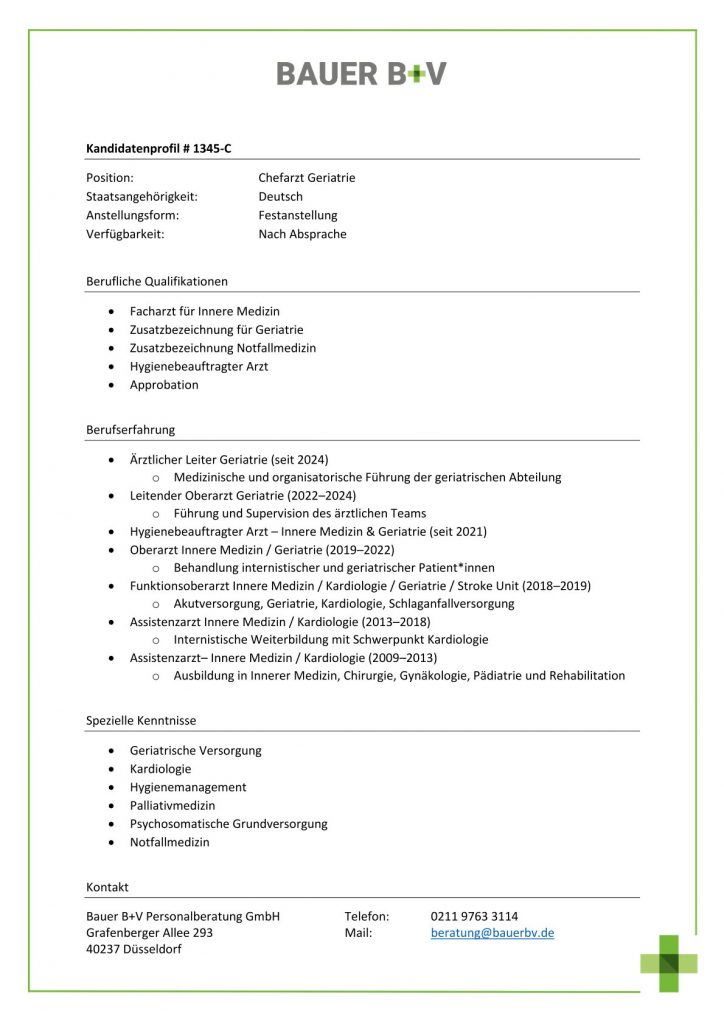 Download - Chefarzt Geriatrie [ # 1345-C] Facharzt für Innere Medizin Zusatzbezeichnung für Geriatrie Zusatzbezeichnung Notfallmedizin Hygienebeauftragter Arzt Approbation Geriatrische Versorgung Kardiologie Hygienemanagement Palliativmedizin Psychosomatische Grundversorgung Notfallmedizin Ärztlicher Leiter Geriatrie seit Medizinische organisatorische Führung der geriatrischen Abteilung Leitender Oberarzt Geriatrie Führung Supervision des ärztlichen Teams Hygienebeauftragter Arzt Innere Medizin Geriatrie seit Oberarzt Innere Medizin Geriatrie Behandlung internistischer geriatrischer Patientinnen Funktionsoberarzt Innere Medizin Kardiologie Geriatrie Stroke Unit Akutversorgung Geriatrie Kardiologie Schlaganfallversorgung Assistenzarzt Innere Medizin Kardiologie Internistische Weiterbildung mit Schwerpunkt Kardiologie Assistenzarzt Innere Medizin Kardiologie Ausbildung in Innerer Medizin Chirurgie Gynäkologie Pädiatrie Rehabilitation