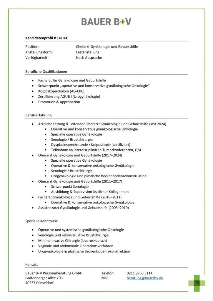 Download - Chefarzt Gynäkologie und Geburtshilfe [# 1410-C] Facharzt für Gynäkologie Geburtshilfe Schwerpunkt operative konservative gynäkologische Onkologie Kolposkopiediplom AG CPC Zertifizierung AGUB I Urogynäkologie Promotion Approbation Operative konservative gynäkologische Onkologie Spezielle operative Gynäkologie Senologie Brustchirurgie Dysplasiesprechstunde Kolposkopie zertifiziert Teilnahme interdisziplinären Tumorkonferenzen QM Schwerpunkt Senologie Ausbildung Supervision ärztlicher Kolleg:innen Operative systemische gynäkologische Onkologie Senologie rekonstruktive Brustchirurgie Minimalinvasive Chirurgie laparoskopisch Vaginale abdominale Operationsverfahren Urogynäkologie plastische Beckenbodenrekonstruktion