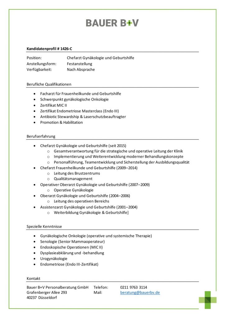 Download - Chefarzt Gynäkologie und Geburtshilfe [# 1426-C] Facharzt für Frauenheilkunde Geburtshilfe Schwerpunkt gynäkologische Onkologie Zertifikat MIC II Zertifikat Endometriose Masterclass Endo III Antibiotic Stewardship Laserschutzbeauftragter Promotion Habilitation Chefarzt Gynäkologie Geburtshilfe Gesamtverantwortung strategische operative Leitung der Klinik Implementierung Weiterentwicklung moderner Behandlungskonzepte Personalführung Teamentwicklung Sicherstellung Ausbildungsqualität Chefarzt Frauenheilkunde Geburtshilfe Leitung des Brustzentrums Qualitätsmanagement Operativer Oberarzt Gynäkologie Geburtshilfe Operative Gynäkologie Oberarzt Gynäkologie Geburtshilfe Leitung des operativen Bereichs Assistenzarzt Gynäkologie Geburtshilfe Weiterbildung Gynäkologie Geburtshilfe Gynäkologische Onkologie operative systemische Therapie Senologie Senior Mammaoperateur Endoskopische Operationen MIC II Dysplasieabklärung Behandlung Urogynäkologie Endometriose Endo IIIZertifikat