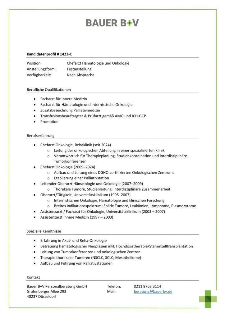 Download - Chefarzt Hämatologie und Onkologie [# 1423-C] Facharzt für Innere Medizin Facharzt für Hämatologie Internistische Onkologie Zusatzbezeichnung Palliativmedizin Transfusionsbeauftragter Prüfarzt gemäß AMG ICHGCP Promotion Chefarzt Onkologie Rehaklinik Leitung der onkologischen Abteilung spezialisierten Klinik Verantwortlich Therapieplanung Studienkoordination interdisziplinäre Tumorkonferenzen Chefarzt Onkologie Aufbau Leitung DGHOzertifizierten Onkologischen Zentrums Etablierung Palliativstation Leitender Oberarzt Hämatologie Onkologie Thorakale Tumore Studienleitung interdisziplinäre Zusammenarbeit Oberarzt Tätigkeit Universitätsklinikum Internistischen Onkologie Hämatologie klinischen Forschung Breites Indikationsspektrum Solide Tumore Leukämien Lymphome Plasmozytome Assistenzarzt Facharzt Onkologie Assistenzarzt Innere Medizin Erfahrung Akut RehaOnkologie Betreuung hämatologischer Neoplasien inkl Hochdosistherapie Stammzelltransplantation Leitung Tumorkonferenzen onkologischen Zentren Therapie thorakaler Tumoren NSCLC SCLC Mesotheliome Aufbau Führung Palliativstationen
