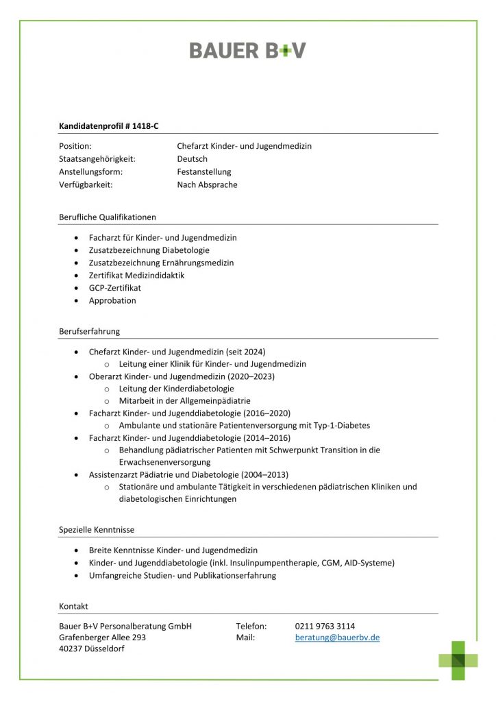 Download - Chefarzt Kinder- und Jugendmedizin [# 1418-C] Facharzt für Kinder und Jugendmedizin Zusatzbezeichnung Diabetologie Zusatzbezeichnung Ernährungsmedizin Zertifikat Medizindidaktik GCPZertifikat Approbation Chefarzt Kinder und Jugendmedizin seit Leitung einer Klinik für Kinder und Jugendmedizin Oberarzt Kinder und Jugendmedizin Leitung der Kinderdiabetologie Mitarbeit in der Allgemeinpädiatrie Facharzt Kinder und Jugenddiabetologie Ambulante stationäre Patientenversorgung mit Typ Diabetes Facharzt Kinder und Jugenddiabetologie Behandlung pädiatrischer Patienten mit Schwerpunkt Transition die Erwachsenenversorgung Assistenzarzt Pädiatrie Diabetologie Stationäre ambulante Tätigkeit verschiedenen pädiatrischen Kliniken diabetologischen Einrichtungen Breite Kenntnisse Kinder und Jugendmedizin Kinder und Jugenddiabetologie Insulinpumpentherapie CGM AIDSysteme Umfangreiche Studien Publikationserfahrung