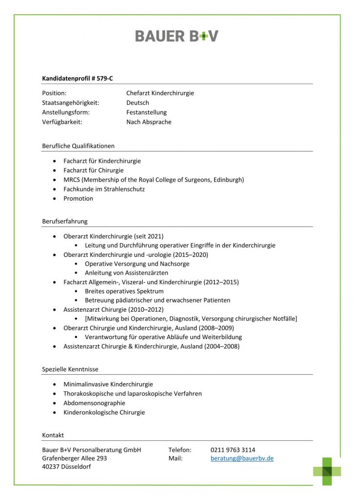 Download - Chefarzt Kinderchirurgie [# 579-C] Facharzt für Kinderchirurgie Facharzt für Chirurgie MRCS Membership of the Royal College of Surgeons Edinburgh Fachkunde im Strahlenschutz Promotion Oberarzt Kinderchirurgie seit Leitung Durchführung operativer Eingriffe Kinderchirurgie Oberarzt Kinderchirurgie urologie Operative Versorgung Nachsorge Anleitung Assistenzärzten Facharzt Allgemein Viszeral Kinderchirurgie Breites operatives Spektrum Betreuung pädiatrischer erwachsener Patienten Assistenzarzt Chirurgie Mitwirkung Operationen Diagnostik Versorgung chirurgischer Notfälle Oberarzt Chirurgie Kinderchirurgie Ausland Verantwortung operative Abläufe Weiterbildung Assistenzarzt Chirurgie Kinderchirurgie Ausland Minimalinvasive Kinderchirurgie Thorakoskopische laparoskopische Verfahren Abdomensonographie Kinderonkologische Chirurgie