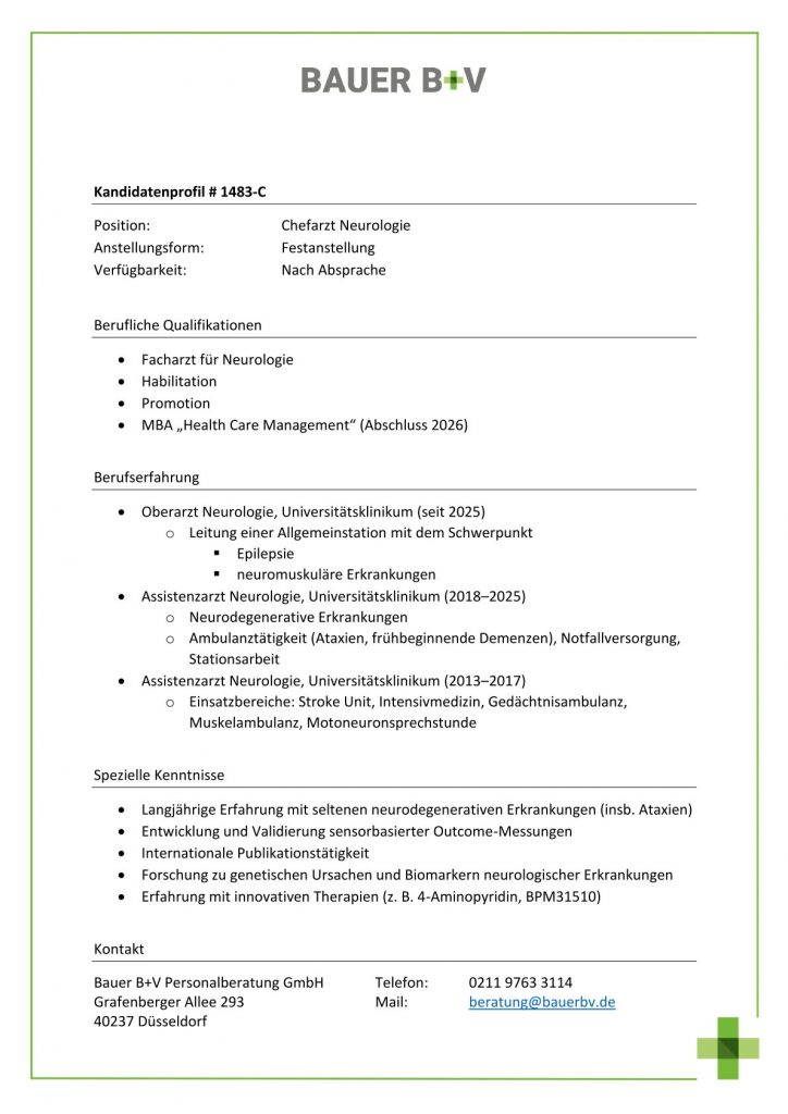 Download - Chefarzt Neurologie [# 1483-C] Facharzt für Neurologie Habilitation Promotion MBA Health Care Management Abschluss Oberarzt Neurologie Universitätsklinikum seit Leitung einer Allgemeinstation mit dem Schwerpunkt Epilepsie neuromuskuläre Erkrankungen Assistenzarzt Neurologie Universitätsklinikum Neurodegenerative Erkrankungen Ambulanztätigkeit Ataxien frühbeginnende Demenzen Notfallversorgung Stationsarbeit Assistenzarzt Neurologie Universitätsklinikum Einsatzbereiche Stroke Unit Intensivmedizin Gedächtnisambulanz Muskelambulanz Motoneuronsprechstunde Langjährige Erfahrung mit seltenen neurodegenerativen Erkrankungen insb Ataxien Entwicklung Validierung sensorbasierter Outcome Messungen Internationale Publikationstätigkeit Forschung zu genetischen Ursachen Biomarkern neurologischer Erkrankungen Erfahrung mit innovativen Therapien z B Aminopyridin BPM