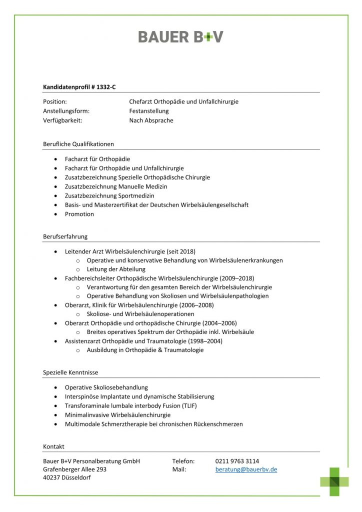 Download - Chefarzt Orthopädie und Unfallchirurgie [# 1332-C] Facharzt für Orthopädie Facharzt für Orthopädie Unfallchirurgie Zusatzbezeichnung Spezielle Orthopädische Chirurgie Zusatzbezeichnung Manuelle Medizin Zusatzbezeichnung Sportmedizin Basis Masterzertifikat der Deutschen Wirbelsäulengesellschaft Promotion Leitender Arzt Wirbelsäulenchirurgie seit Operative konservative Behandlung von Wirbelsäulenerkrankungen Leitung der Abteilung Fachbereichsleiter Orthopädische Wirbelsäulenchirurgie Verantwortung für den gesamten Bereich der Wirbelsäulenchirurgie Operative Behandlung von Skoliosen Wirbelsäulenpathologien Oberarzt Klinik für Wirbelsäulenchirurgie Skoliose Wirbelsäulenoperationen Oberarzt Orthopädie orthopädische Chirurgie Breites operatives Spektrum der Orthopädie inkl Wirbelsäule Assistenzarzt Orthopädie Traumatologie Ausbildung in Orthopädie Traumatologie Operative Skoliosebehandlung Interspinöse Implantate dynamische Stabilisierung Transforaminale lumbale interbody Fusion TLIF Minimalinvasive Wirbelsäulenchirurgie Multimodale Schmerztherapie bei chronischen Rückenschmerzen