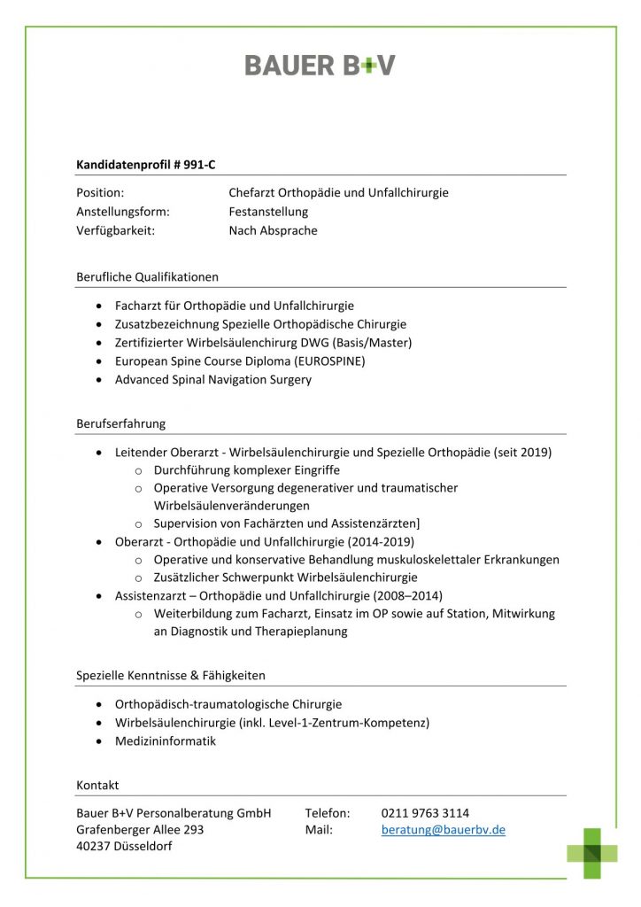 Download - Chefarzt Orthopädie und Unfallchirurgie [# 991-C] Facharzt für Orthopädie und Unfallchirurgie Zusatzbezeichnung Spezielle Orthopädische Chirurgie Zertifizierter Wirbelsäulenchirurg DWG Basis Master European Spine Course Diploma EUROSPINE Advanced Spinal Navigation Surgery Leitender Oberarzt Wirbelsäulenchirurgie Spezielle Orthopädie Durchführung komplexer Eingriffe Operative Versorgung degenerativer traumatischer Wirbelsäulenveränderungen Supervision Fachärzten Assistenzärzten Oberarzt Orthopädie Unfallchirurgie Operative konservative Behandlung muskuloskelettaler Erkrankungen Zusätzlicher Schwerpunkt Wirbelsäulenchirurgie Assistenzarzt Orthopädie Unfallchirurgie Weiterbildung Facharzt Einsatz OP Station Mitwirkung Diagnostik Therapieplanung Orthopädisch traumatologische Chirurgie Wirbelsäulenchirurgie Level Zentrum Kompetenz Medizininformatik