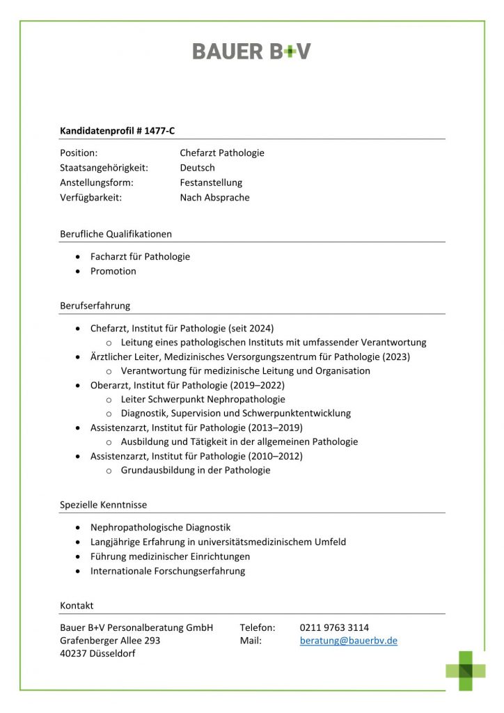 Download - Chefarzt Pathologie [# 1477-C] Facharzt für Pathologie Promotion Chefarzt Institut für Pathologie Leitung eines pathologischen Instituts mit umfassender Verantwortung Ärztlicher Leiter Medizinisches Versorgungszentrum für Pathologie Verantwortung für medizinische Leitung Organisation Oberarzt Institut für Pathologie Leiter Schwerpunkt Nephropathologie Diagnostik Supervision Schwerpunktentwicklung Assistenzarzt Institut für Pathologie Ausbildung Tätigkeit in der allgemeinen Pathologie Assistenzarzt Institut für Pathologie Grundausbildung in der Pathologie Nephropathologische Diagnostik Langjährige Erfahrung in universitätsmedizinischem Umfeld Führung medizinischer Einrichtungen Internationale Forschungserfahrung