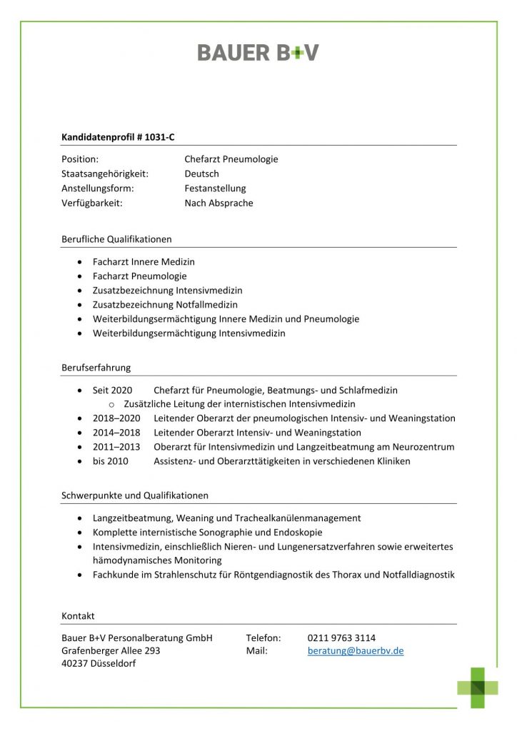 Download - Chefarzt Pneumologie [# 1031-C] Facharzt Innere Medizin Facharzt Pneumologie Zusatzbezeichnung Intensivmedizin Zusatzbezeichnung Notfallmedizin Weiterbildungsermächtigung Innere Medizin Pneumologie Weiterbildungsermächtigung Intensivmedizin Chefarzt Pneumologie Beatmungs Schlafmedizin Leitung internistischen Intensivmedizin Leitender Oberarzt pneumologischen Intensiv Weaningstation Leitender Oberarzt Intensiv Weaningstation Oberarzt Intensivmedizin Langzeitbeatmung Neurozentrum Assistenz Oberarzttätigkeiten Kliniken Langzeitbeatmung Weaning Trachealkanülenmanagement internistische Sonographie Endoskopie Intensivmedizin Nieren Lungenersatzverfahren erweitertes hämodynamisches Monitoring Fachkunde Strahlenschutz Röntgendiagnostik Thorax Notfalldiagnostik