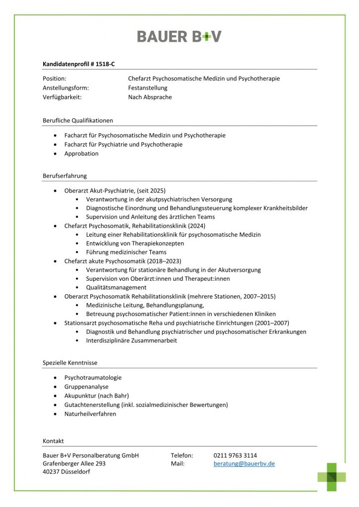 Download - Chefarzt Psychosomatische Medizin und Psychotherapie [# 1518-C] Facharzt für Psychosomatische Medizin Psychotherapie Facharzt für Psychiatrie Psychotherapie Approbation Oberarzt Akut Psychiatrie seit Verantwortung in der akutpsychiatrischen Versorgung Diagnostische Einordnung Behandlungssteuerung komplexer Krankheitsbilder Supervision Anleitung des ärztlichen Teams Chefarzt Psychosomatik Rehabilitationsklinik Leitung einer Rehabilitationsklinik für psychosomatische Medizin Entwicklung von Therapiekonzepten Führung medizinischer Teams Chefarzt akute Psychosomatik Verantwortung für stationäre Behandlung in der Akutversorgung Supervision von Oberärztinnen Therapeutinnen Qualitätsmanagement Oberarzt Psychosomatik Rehabilitationsklinik mehrere Stationen Medizinische Leitung Behandlungsplanung Betreuung psychosomatischer Patientinnen in verschiedenen Kliniken Stationsarzt psychosomatische Reha psychiatrische Einrichtungen Diagnostik Behandlung psychiatrischer psychosomatischer Erkrankungen Interdisziplinäre Zusammenarbeit Psychotraumatologie Gruppenanalyse Akupunktur nach Bahr Gutachtenerstellung inkl sozialmedizinischer Bewertungen Naturheilverfahren