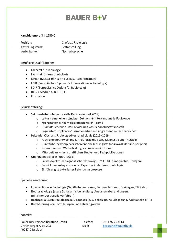 Download - Chefarzt Radiologie [# 1280-C] Facharzt für Radiologie Facharzt für Neuroradiologie MHBA Master of Health Business Administration EBIR Europäisches Diplom für Interventionelle Radiologie EDIR Europäisches Diplom für Radiologie DEGIR Module A B C D E Promotion Sektionsleiter Interventionelle Radiologie Leitung einer eigenständigen Sektion für interventionelle Radiologie Koordination eines multiprofessionellen Teams Qualitätssicherung Entwicklung von Behandlungsstandards Enge interdisziplinäre Zusammenarbeit mit angrenzenden Fachbereichen Leitender Oberarzt Radiologie Neuroradiologie Fachliche Verantwortung für neuroradiologische Diagnostik Therapie Durchführung komplexer interventioneller Eingriffe neurovaskulär peripher Supervision Weiterbildung von Assistenzärzt:innen Mitarbeit an wissenschaftlichen Studien Fachpublikationen Oberarzt Radiologie Breites Spektrum diagnostischer Radiologie MRT CT Sonographie Röntgen Entwicklung subspezialisierter Expertise in der Neuroradiologie Einführung strukturierter Befundungsprozesse Interventionelle Radiologie Gefäßinterventionen Tumorablationen Drainagen TIPS Neuroradiologie akute Schlaganfallbehandlung Aneurysmabehandlungen spinalinterventionelle Verfahren Hochspezialisierte radiologische Diagnostik onkologische Bildgebung funktionelle MRT Durchführung von Fortbildungen Lehrtätigkeiten