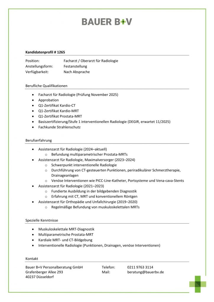 Download - Facharzt / Oberarzt für Radiologie [# 1265] Facharzt Radiologie Approbation Q Zertifikat Kardio CT Q Zertifikat Kardio MRT Q Zertifikat Prostata MRT Basiszertifizierung Stufe interventionellen Radiologie DEGIR erwartet Fachkunde Strahlenschutz Assistenzarzt Radiologie aktuell Befundung multiparametrischer Prostata MRTs Assistenzarzt Radiologie Maximalversorger Schwerpunkt interventionelle Radiologie Durchführung CT gesteuerten Punktionen periradikulärer Schmerztherapie Drainageanlagen Venöse Interventionen PICC Line Katheter Portsysteme Vena cava Stents Assistenzarzt Radiologie Fundierte Ausbildung bildgebenden Diagnostik Erfahrung CT MRT konventionellem Röntgen Assistenzarzt Orthopädie Unfallchirurgie Regelmäßige Befundung muskuloskelettalen MRTs Muskuloskelettale MRT Diagnostik Multiparametrische Prostata MRT Kardiale MRT CT Bildgebung Interventionelle Radiologie Punktionen Drainagen venöse Interventionen