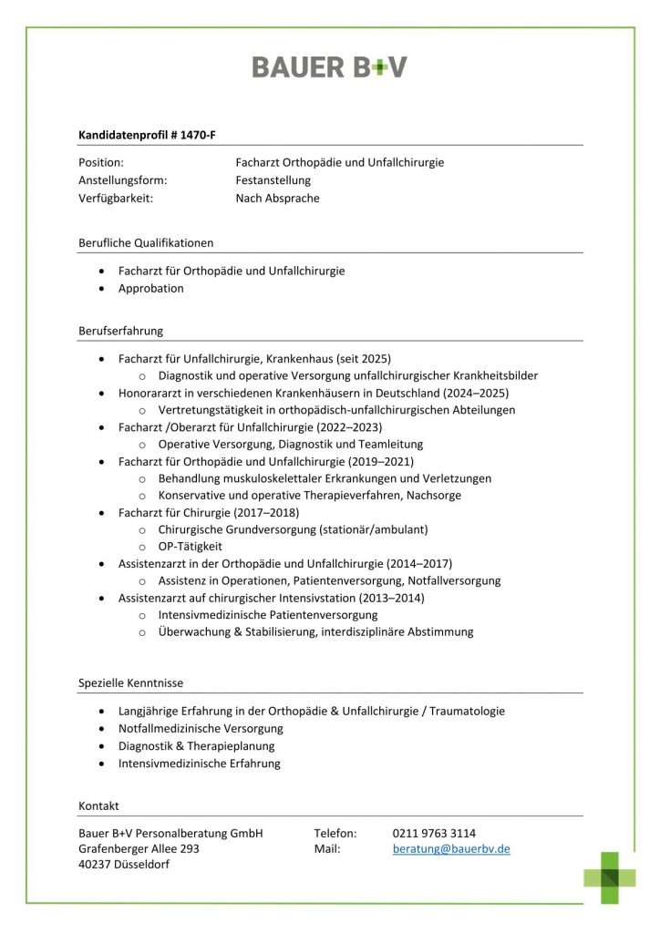 Download - Facharzt Orthopädie und Unfallchirurgie [# 1470-F] Facharzt für Orthopädie Unfallchirurgie Approbation Facharzt für Unfallchirurgie Krankenhaus seit Diagnostik operative Versorgung unfallchirurgischer Krankheitsbilder Honorararzt in verschiedenen Krankenhäusern in Deutschland Vertretungstätigkeit in orthopädischunfallchirurgischen Abteilungen Facharzt Oberarzt für Unfallchirurgie Operative Versorgung Diagnostik Teamleitung Facharzt für Orthopädie Unfallchirurgie Behandlung muskuloskelettaler Erkrankungen Verletzungen Konservative operative Therapieverfahren Nachsorge Facharzt für Chirurgie Chirurgische Grundversorgung stationär ambulant OPTätigkeit Assistenzarzt in der Orthopädie der Unfallchirurgie Assistenz in Operationen Patientenversorgung Notfallversorgung Assistenzarzt auf chirurgischer Intensivstation Intensivmedizinische Patientenversorgung Überwachung Stabilisierung interdisziplinäre Abstimmung Langjährige Erfahrung in der Orthopädie Unfallchirurgie Traumatologie Notfallmedizinische Versorgung Diagnostik Therapieplanung Intensivmedizinische Erfahrung
