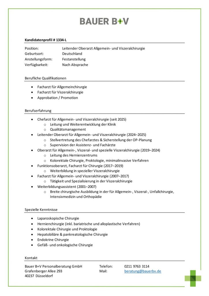 Download - Leitender Oberarzt Allgemein- und Viszeralchirurgie [# 1334-L] Facharzt für Allgemeinchirurgie Facharzt für Viszeralchirurgie Approbation Promotion Chefarzt für Allgemein Viszeralchirurgie seit Leitung Weiterentwicklung der Klinik Qualitätsmanagement Leitender Oberarzt für Allgemein Viszeralchirurgie Stellvertretung des Chefarztes Sicherstellung der OPPlanung Supervision der Assistenz Fachärzte Oberarzt für Allgemein Viszeral spezielle Viszeralchirurgie Leitung des Hernienzentrums Kolorektale Chirurgie Proktologie minimalinvasive Verfahren Funktionsoberarzt Facharzt für Chirurgie Weiterbildung in spezieller Viszeralchirurgie Facharzt für Allgemein Viszeralchirurgie Tätigkeit Spezialisierung in der Viszeralchirurgie Weiterbildungsassistent Breite chirurgische Ausbildung in der für Allgemein Viszeral Unfallchirurgie Intensivmedizin Orthopädie Laparoskopische Chirurgie Hernienchirurgie inkl bariatrische alloplastische Verfahren Kolorektale Chirurgie Proktologie Hepatobiliäre pankreatologische Chirurgie Endokrine Chirurgie Gefäß onkologische Chirurgie