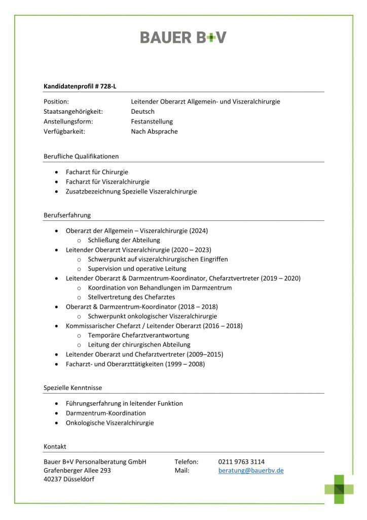 Download - Leitender Oberarzt Allgemein- und Viszeralchirurgie [# 728-L] Facharzt für Chirurgie Facharzt für Viszeralchirurgie Zusatzbezeichnung Spezielle Viszeralchirurgie Oberarzt der Allgemein Viszeralchirurgie Schließung der Abteilung Leitender Oberarzt Viszeralchirurgie Schwerpunkt auf viszeralchirurgischen Eingriffen Supervision operative Leitung Leitender Oberarzt Darmzentrum Koordinator Chefarztvertreter Koordination von Behandlungen im Darmzentrum Stellvertretung des Chefarztes Oberarzt Darmzentrum Koordinator Schwerpunkt onkologischer Viszeralchirurgie Kommissarischer Chefarzt Leitender Oberarzt Temporäre Chefarztverantwortung Leitung der chirurgischen Abteilung Leitender Oberarzt Chefarztvertreter Facharzt Oberarzttätigkeiten Führungserfahrung in leitender Funktion Darmzentrum Koordination Onkologische Viszeralchirurgie