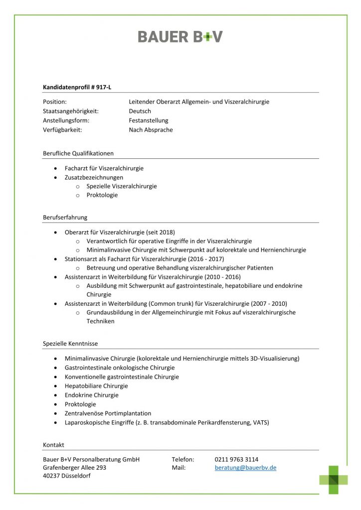 Download - Leitender Oberarzt Allgemein- und Viszeralchirurgie [# 917-L] Facharzt für Viszeralchirurgie Zusatzbezeichnungen Spezielle Viszeralchirurgie Proktologie Oberarzt für Viszeralchirurgie Verantwortlich für operative Eingriffe in der Viszeralchirurgie Minimalinvasive Chirurgie mit Schwerpunkt auf kolorektale Hernienchirurgie Stationsarzt als Facharzt für Viszeralchirurgie Betreuung operative Behandlung viszeralchirurgischer Patienten Assistenzarzt in Weiterbildung für Viszeralchirurgie Ausbildung mit Schwerpunkt auf gastrointestinale hepatobiliare endokrine Chirurgie Assistenzarzt in Weiterbildung Common trunk für Viszeralchirurgie Grundausbildung in der Allgemeinchirurgie mit Fokus auf viszeralchirurgische Techniken Minimalinvasive Chirurgie kolorektale Hernienchirurgie mittels D Visualisierung Gastrointestinale onkologische Chirurgie Konventionelle gastrointestinale Chirurgie Hepatobiliare Chirurgie Endokrine Chirurgie Proktologie Zentralvenöse Portimplantation Laparoskopische Eingriffe transabdominale Perikardfensterung VATS