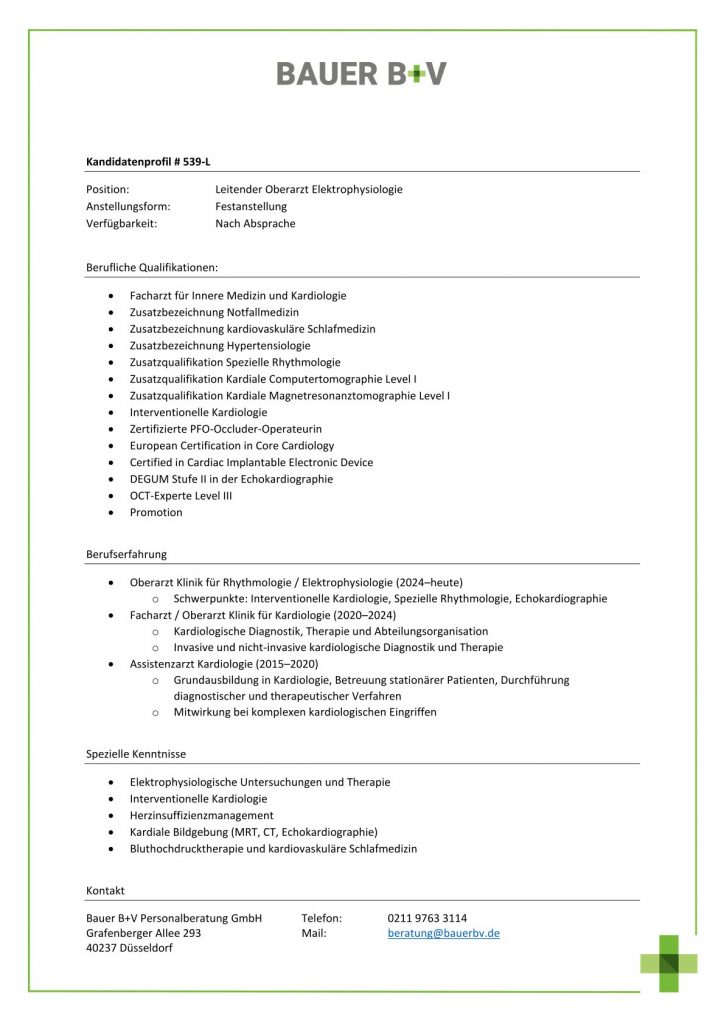 Download - Leitender Oberarzt Elektrophysiologie [# 539-L] Facharzt für Innere Medizin Kardiologie Zusatzbezeichnung Notfallmedizin Zusatzbezeichnung kardiovaskuläre Schlafmedizin Zusatzbezeichnung Hypertensiologie Zusatzqualifikation Spezielle Rhythmologie Zusatzqualifikation Kardiale Computertomographie Level Zusatzqualifikation Kardiale Magnetresonanztomographie Level Interventionelle Kardiologie Zertifizierte PFO Occluder Operateurin European Certification in Core Cardiology Certified in Cardiac Implantable Electronic Device DEGUM Stufe in der Echokardiographie OCT Experte Level Promotion Oberarzt Klinik für Rhythmologie Elektrophysiologie Schwerpunkte Interventionelle Kardiologie Spezielle Rhythmologie Echokardiographie Facharzt Oberarzt Klinik für Kardiologie Kardiologische Diagnostik Therapie Abteilungsorganisation Invasive nichtinvasive kardiologische Diagnostik Therapie Assistenzarzt Kardiologie Grundausbildung in Kardiologie Betreuung stationärer Patienten Durchführung diagnostischer therapeutischer Verfahren Mitwirkung bei komplexen kardiologischen Eingriffen Elektrophysiologische Untersuchungen Therapie Interventionelle Kardiologie Herzinsuffizienzmanagement Kardiale Bildgebung MRT CT Echokardiographie Bluthochdrucktherapie kardiovaskuläre Schlafmedizin
