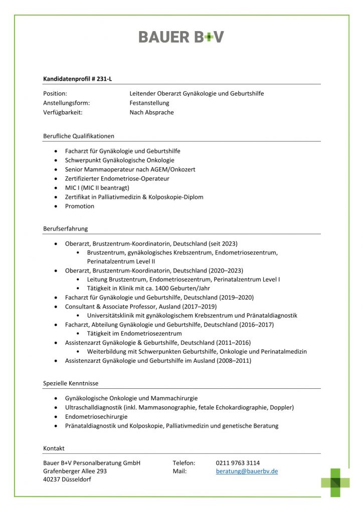Download - Leitender Oberarzt Gynäkologie und Geburtshilfe [# 231-L] Facharzt für Gynäkologie Geburtshilfe Schwerpunkt Gynäkologische Onkologie Senior Mammaoperateur nach AGEM Onkozert Zertifizierter Endometriose Operateur MIC I MIC II beantragt Zertifikat in Palliativmedizin Kolposkopie Diplom Promotion Oberarzt Brustzentrum Koordinatorin Deutschland Brustzentrum gynäkologisches Krebszentrum Endometriosezentrum Perinatalzentrum Level II Oberarzt Brustzentrum Koordinatorin Deutschland Leitung Brustzentrum Endometriosezentrum Perinatalzentrum Level I Tätigkeit in Klinik mit ca Geburten Jahr Facharzt für Gynäkologie Geburtshilfe Deutschland Consultant Associate Professor Ausland Universitätsklinik mit gynäkologischem Krebszentrum Pränataldiagnostik Facharzt Abteilung Gynäkologie Geburtshilfe Deutschland Tätigkeit im Endometriosezentrum Assistenzarzt Gynäkologie Geburtshilfe Deutschland Weiterbildung mit Schwerpunkten Geburtshilfe Onkologie Perinatalmedizin Assistenzarzt Gynäkologie Geburtshilfe Ausland Gynäkologische Onkologie Mammachirurgie Ultraschalldiagnostik inkl Mammasonographie fetale Echokardiographie Doppler Endometriosechirurgie Pränataldiagnostik Kolposkopie Palliativmedizin genetische Beratung