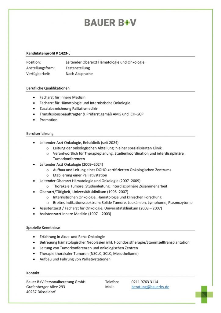 Download - Leitender Oberarzt Hämatologie und Onkologie [# 1423-L] Facharzt für Innere Medizin Facharzt für Hämatologie Internistische Onkologie Zusatzbezeichnung Palliativmedizin Transfusionsbeauftragter Prüfarzt gemäß AMG ICHGCP Promotion Chefarzt Onkologie Rehaklinik Leitung der onkologischen Abteilung spezialisierten Klinik Verantwortlich Therapieplanung Studienkoordination interdisziplinäre Tumorkonferenzen Chefarzt Onkologie Aufbau Leitung DGHOzertifizierten Onkologischen Zentrums Etablierung Palliativstation Leitender Oberarzt Hämatologie Onkologie Thorakale Tumore Studienleitung interdisziplinäre Zusammenarbeit Oberarzt Tätigkeit Universitätsklinikum Internistischen Onkologie Hämatologie klinischen Forschung Breites Indikationsspektrum Solide Tumore Leukämien Lymphome Plasmozytome Assistenzarzt Facharzt Onkologie Assistenzarzt Innere Medizin Erfahrung Akut RehaOnkologie Betreuung hämatologischer Neoplasien inkl Hochdosistherapie Stammzelltransplantation Leitung Tumorkonferenzen onkologischen Zentren Therapie thorakaler Tumoren NSCLC SCLC Mesotheliome Aufbau Führung Palliativstationen
