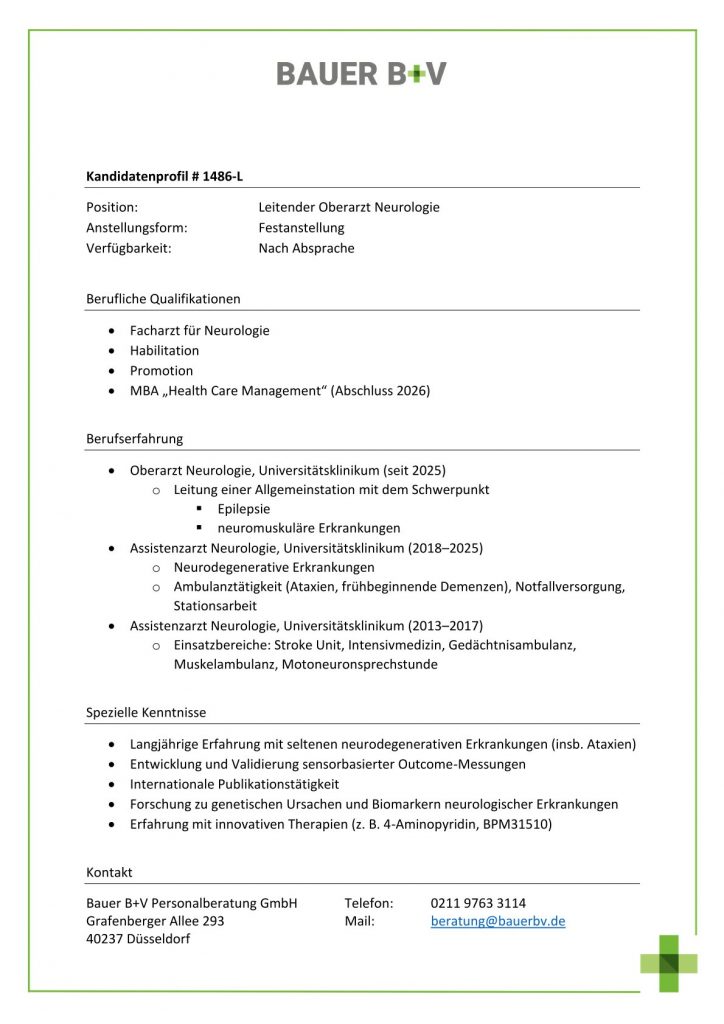 Download - Leitender Oberarzt Neurologie [# 1486-L] Facharzt für Neurologie Habilitation Promotion MBA Health Care Management Abschluss Oberarzt Neurologie Universitätsklinikum seit Leitung einer Allgemeinstation mit dem Schwerpunkt Epilepsie neuromuskuläre Erkrankungen Assistenzarzt Neurologie Universitätsklinikum Neurodegenerative Erkrankungen Ambulanztätigkeit Ataxien frühbeginnende Demenzen Notfallversorgung Stationsarbeit Assistenzarzt Neurologie Universitätsklinikum Einsatzbereiche Stroke Unit Intensivmedizin Gedächtnisambulanz Muskelambulanz Motoneuronsprechstunde Langjährige Erfahrung mit seltenen neurodegenerativen Erkrankungen insb Ataxien Entwicklung Validierung sensorbasierter OutcomeMessungen Internationale Publikationstätigkeit Forschung zu genetischen Ursachen Biomarkern neurologischer Erkrankungen Erfahrung mit innovativen Therapien z B Aminopyridin BPM
