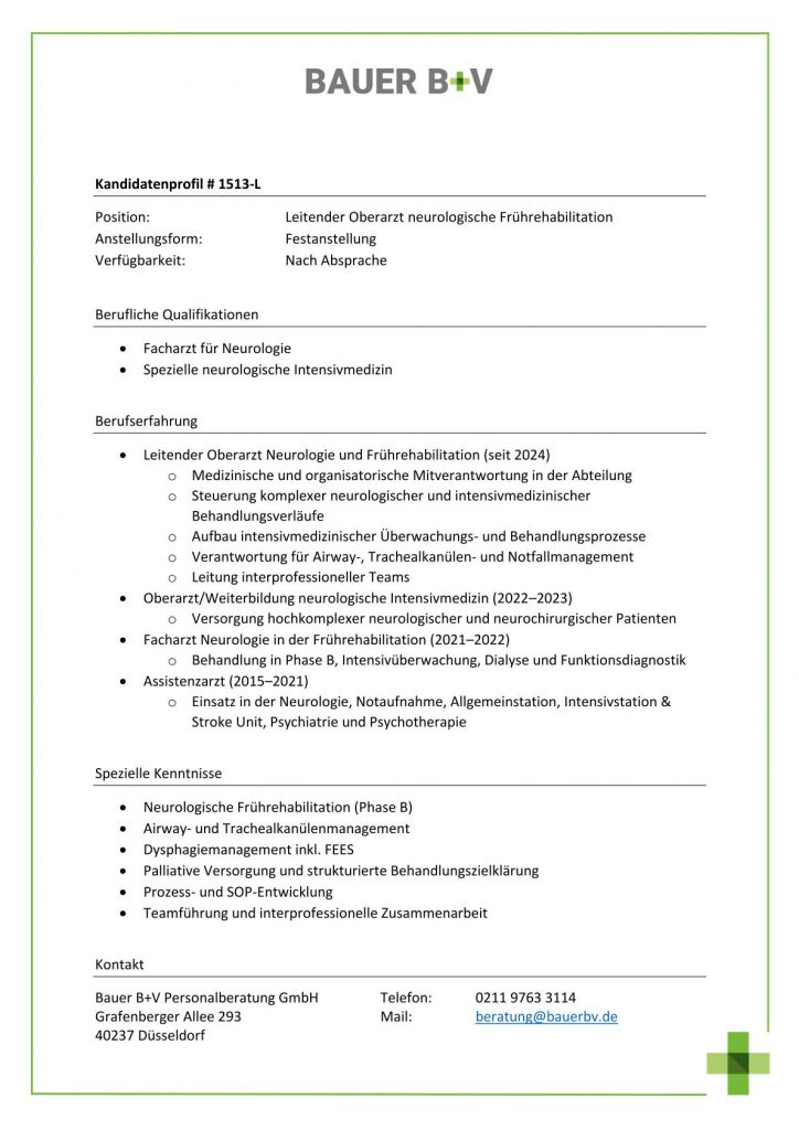 Download - Leitender Oberarzt neurologische Frührehabilitation [# 1513-L] Facharzt für Neurologie Spezielle neurologische Intensivmedizin Leitender Oberarzt Neurologie Frührehabilitation seit Medizinische organisatorische Mitverantwortung in der Abteilung Steuerung komplexer neurologischer intensivmedizinischer Behandlungsverläufe Aufbau intensivmedizinischer Überwachungs Behandlungsprozesse Verantwortung für Airway Trachealkanülen Notfallmanagement Leitung interprofessioneller Teams OberarztWeiterbildung neurologische Intensivmedizin Versorgung hochkomplexer neurologischer neurochirurgischer Patienten Facharzt Neurologie in der Frührehabilitation Behandlung in Phase B Intensivüberwachung Dialyse Funktionsdiagnostik Assistenzarzt Einsatz in der Neurologie Notaufnahme Allgemeinstation Intensivstation Stroke Unit Psychiatrie Psychotherapie Neurologische Frührehabilitation Phase B Airway Trachealkanülenmanagement Dysphagiemanagement inkl FEES Palliative Versorgung strukturierte Behandlungszielklärung Prozess SOPEntwicklung Teamführung interprofessionelle Zusammenarbeit