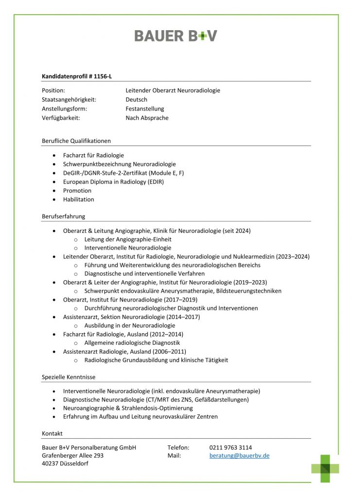 Download - Leitender Oberarzt Neuroradiologie [# 1156-L] Facharzt für Radiologie Schwerpunktbezeichnung Neuroradiologie DeGIR DGNR Stufe Zertifikat Module E F European Diploma in Radiology EDIR Promotion Habilitation Oberarzt Leitung Angiographie Klinik für Neuroradiologie seit Leitung der Angiographie Einheit Interventionelle Neuroradiologie Leitender Oberarzt Institut für Radiologie Neuroradiologie Nuklearmedizin Führung Weiterentwicklung des neuroradiologischen Bereichs Diagnostische interventionelle Verfahren Oberarzt Leiter der Angiographie Institut für Neuroradiologie Schwerpunkt endovaskuläre Aneurysmatherapie Bildsteuerungstechniken Oberarzt Institut für Neuroradiologie Durchführung neuroradiologischer Diagnostik Interventionen Assistenzarzt Sektion Neuroradiologie Ausbildung in der Neuroradiologie Facharzt für Radiologie Ausland Allgemeine radiologische Diagnostik Assistenzarzt Radiologie Ausland Radiologische Grundausbildung klinische Tätigkeit Interventionelle Neuroradiologie inkl endovaskuläre Aneurysmatherapie Diagnostische Neuroradiologie CT MRT des ZNS Gefäßdarstellungen Neuroangiographie Strahlendosis Optimierung Erfahrung im Aufbau Leitung neurovaskulärer Zentren