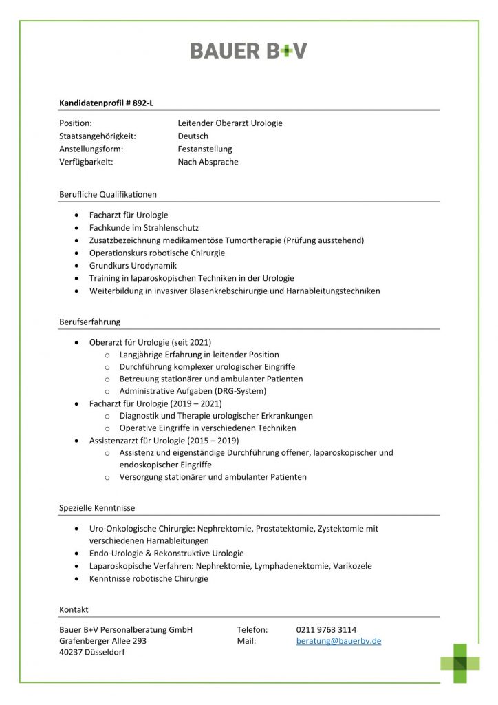 Download - Leitender Oberarzt Urologie [# 892-L] Facharzt Urologie Fachkunde Strahlenschutz Grundkurs Urodynamik Training laparoskopischen Techniken Urologie Weiterbildung invasiver Blasenkrebschirurgie Harnableitungstechniken Oberarzt Urologie Langjährige Erfahrung leitender Position Durchführung komplexer urologischer Eingriffe Betreuung stationärer ambulanter Patienten Administrative Aufgaben DRG System Facharzt Urologie Diagnostik Therapie urologischer Erkrankungen Operative Eingriffe verschiedenen Techniken Assistenzarzt Urologie Assistenz eigenständige Durchführung offener laparoskopischer endoskopischer Eingriffe Versorgung stationärer ambulanter Patienten Uro Onkologische Chirurgie Nephrektomie Prostatektomie Zystektomie verschiedenen Harnableitungen Endo Urologie Rekonstruktive Urologie Laparoskopische Verfahren Nephrektomie Lymphadenektomie Varikozele