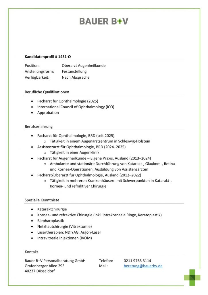 Download - Oberarzt Augenheilkunde [# 1431-O] Facharzt für Ophthalmologie International Council of Ophthalmology ICO Approbation Facharzt Ophthalmologie Tätigkeit Augenarztzentrum SchleswigHolstein Assistenzarzt Ophthalmologie Tätigkeit Augenklinik Facharzt Augenheilkunde Eigene Praxis Ausland Ambulante stationäre Durchführung Katarakt Glaukom Retina Kornea Operationen Ausbildung Assistenzärzte Facharzt Oberarzt Ophthalmologie Ausland Tätigkeit Krankenhäusern Schwerpunkten Katarakt Kornea refraktive Chirurgie Kataraktchirurgie Kornea refraktive Chirurgie intrakorneale Ringe Keratoplastik Blepharoplastik Netzhautchirurgie Vitrektomie Lasertherapien NDYAG ArgonLaser Intravitreale Injektionen IVOM