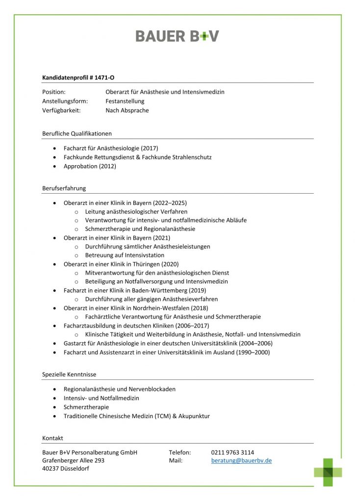 Download - Oberarzt für Anästhesie und Intensivmedizin [# 1471-O] Facharzt für Anästhesiologie Fachkunde Rettungsdienst Fachkunde Strahlenschutz Approbation Oberarzt in einer Klinik in Bayern Leitung anästhesiologischer Verfahren Verantwortung für intensiv notfallmedizinische Abläufe Schmerztherapie Regionalanästhesie Oberarzt in einer Klinik in Bayern Durchführung sämtlicher Anästhesieleistungen Betreuung auf Intensivstation Oberarzt in einer Klinik in Thüringen Mitverantwortung für den anästhesiologischen Dienst Beteiligung an Notfallversorgung Intensivmedizin Facharzt in einer Klinik in BadenWürttemberg Durchführung aller gängigen Anästhesieverfahren Oberarzt in einer Klinik in NordrheinWestfalen Fachärztliche Verantwortung für Anästhesie Schmerztherapie Facharztausbildung in deutschen Kliniken Klinische Tätigkeit Weiterbildung in Anästhesie Notfall Intensivmedizin Gastarzt für Anästhesiologie in einer deutschen Universitätsklinik Facharzt Assistenzarzt in einer Universitätsklinik im Ausland Regionalanästhesie Nervenblockaden Intensiv Notfallmedizin Schmerztherapie Traditionelle Chinesische Medizin TCM Akupunktur
