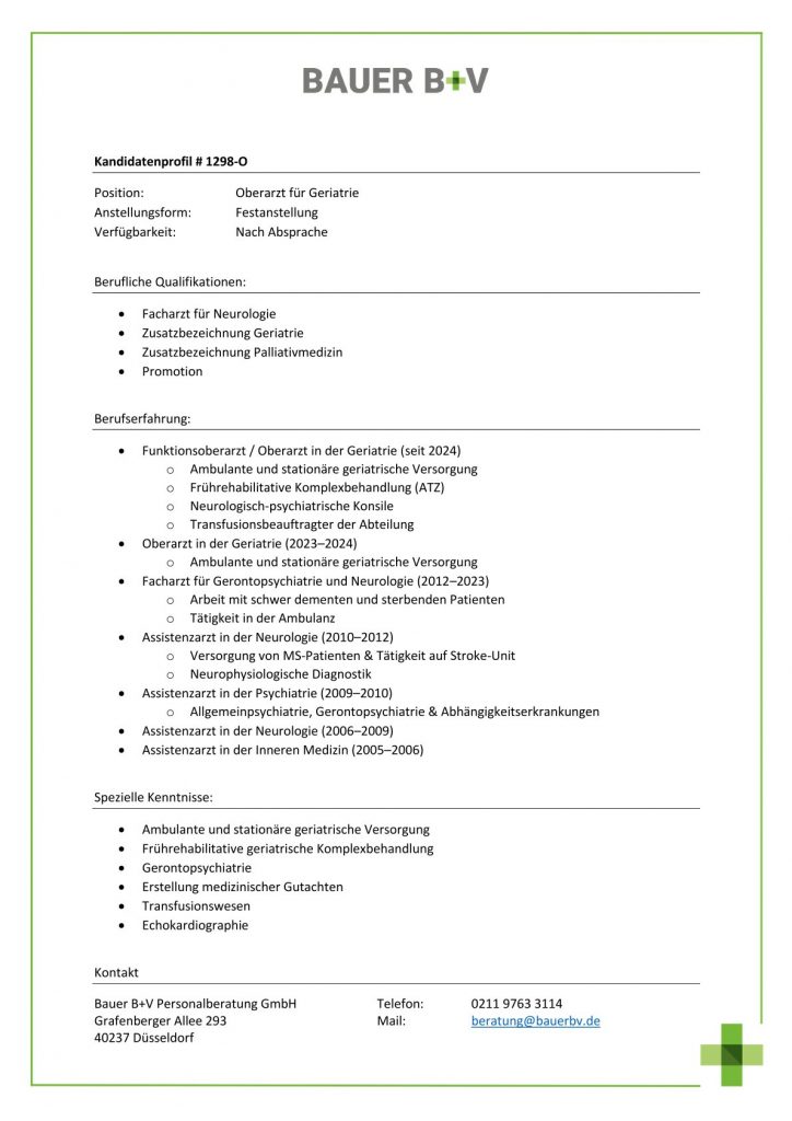 Download - Oberarzt für Geriatrie [# 1298-O] Facharzt für Neurologie Zusatzbezeichnung Geriatrie Zusatzbezeichnung Palliativmedizin Promotion Funktionsoberarzt Oberarzt in der Geriatrie Ambulante stationäre geriatrische Versorgung Frührehabilitative Komplexbehandlung ATZ Neurologisch psychiatrische Konsile Transfusionsbeauftragter der Abteilung Oberarzt in der Geriatrie Ambulante stationäre geriatrische Versorgung Facharzt für Gerontopsychiatrie Neurologie Arbeit mit schwer dementen sterbenden Patienten Tätigkeit in der Ambulanz Assistenzarzt in der Neurologie Versorgung von MS Patienten Tätigkeit auf Stroke Unit Neurophysiologische Diagnostik Assistenzarzt in der Psychiatrie Allgemeinpsychiatrie Gerontopsychiatrie Abhängigkeitserkrankungen Assistenzarzt in der Neurologie Assistenzarzt in der Inneren Medizin Ambulante stationäre geriatrische Versorgung Frührehabilitative geriatrische Komplexbehandlung Gerontopsychiatrie Erstellung medizinischer Gutachten Transfusionswesen Echokardiographie