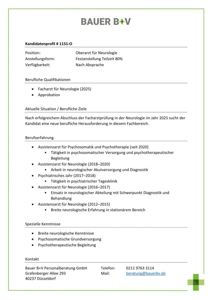Download - Oberarzt für Neurologie [# 1151-O] Facharzt für Neurologie Approbation Assistenzarzt für Psychosomatik Psychotherapie seit Tätigkeit in psychosomatischer Versorgung psychotherapeutischer Begleitung Assistenzarzt für Neurologie Arbeit in neurologischer Akutversorgung Diagnostik Psychiatrisches Jahr Tätigkeit in psychiatrischer Tagesklinik Assistenzarzt für Neurologie Einsatz in neurologischer Abteilung mit Schwerpunkt Diagnostik Behandlung Assistenzarzt für Neurologie Breite neurologische Erfahrung in stationärem Bereich Breite neurologische Kenntnisse Psychosomatische Grundversorgung Psychotherapeutische Begleitung