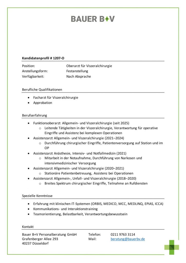 Download - Oberarzt für Viszeralchirurgie [# 1207-O] Facharzt für Viszeralchirurgie Approbation Funktionsoberarzt Allgemein Viszeralchirurgie seit Leitende Tätigkeiten in der Viszeralchirurgie Verantwortung für operative Eingriffe Assistenz bei komplexen Operationen Assistenzarzt Allgemein Viszeralchirurgie Durchführung chirurgischer Eingriffe Patientenversorgung auf Station im OP Assistenzarzt Anästhesie Intensiv Notfallmedizin Mitarbeit in der Notaufnahme Durchführung von Narkosen intensivmedizinischer Versorgung Assistenzarzt Allgemein Viszeralchirurgie Stationäre Patientenbetreuung Assistenz bei Operationen Assistenzarzt Allgemein Unfall Viszeralchirurgie Breites Spektrum chirurgischer Eingriffe Teilnahme an Rufdiensten Erfahrung mit klinischen ITSystemen ORBIS MEDICO MCC MEDLINQ EPIAS ICCA Kommunikations Interaktionstraining Teamorientierung Belastbarkeit Verantwortungsbewusstsein