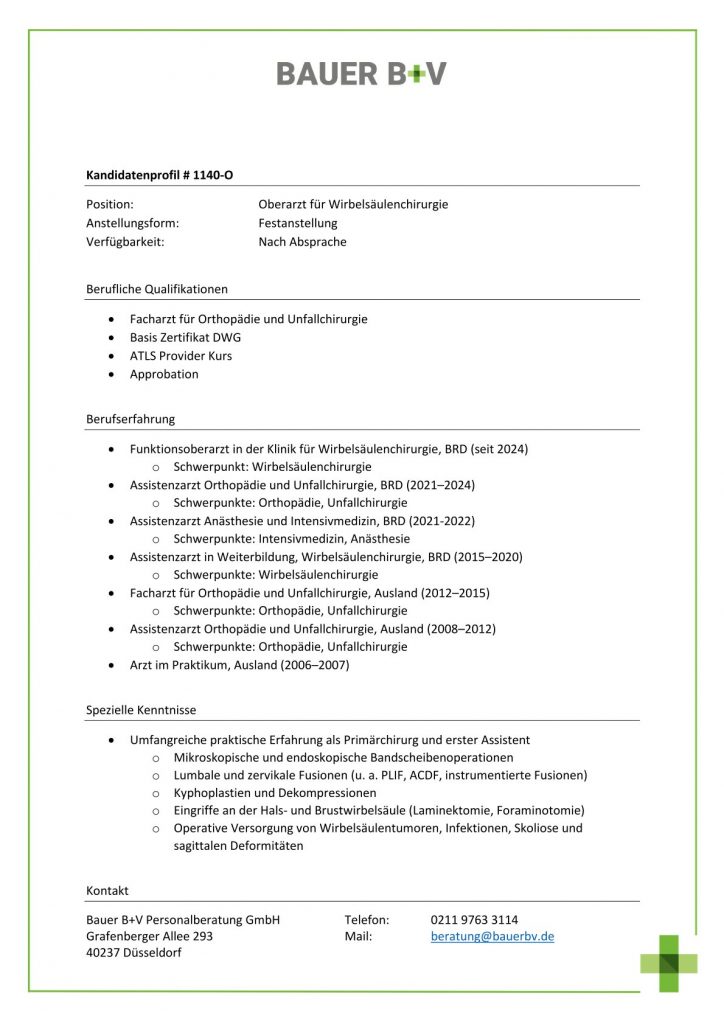 Download - Oberarzt für Wirbelsäulenchirurgie [# 1140-O] Facharzt für Orthopädie Unfallchirurgie Basis Zertifikat DWG ATLS Provider Kurs Approbation Funktionsoberarzt Klinik Wirbelsäulenchirurgie BRD Schwerpunkt Wirbelsäulenchirurgie Assistenzarzt Orthopädie Unfallchirurgie BRD Schwerpunkte Orthopädie Unfallchirurgie Assistenzarzt Anästhesie Intensivmedizin BRD Schwerpunkte Intensivmedizin Anästhesie Assistenzarzt Weiterbildung Wirbelsäulenchirurgie BRD Schwerpunkte Wirbelsäulenchirurgie Facharzt Orthopädie Unfallchirurgie Ausland Schwerpunkte Orthopädie Unfallchirurgie Assistenzarzt Orthopädie Unfallchirurgie Ausland Schwerpunkte Orthopädie Unfallchirurgie Arzt Praktikum Ausland Umfangreiche praktische Erfahrung Primärchirurg erster Assistent Mikroskopische endoskopische Bandscheibenoperationen Lumbale zervikale Fusionen PLIF ACDF instrumentierte Fusionen Kyphoplastien Dekompressionen Eingriffe Hals Brustwirbelsäule Laminektomie Foraminotomie Operative Versorgung Wirbelsäulentumoren Infektionen Skoliose sagittalen Deformitäten
