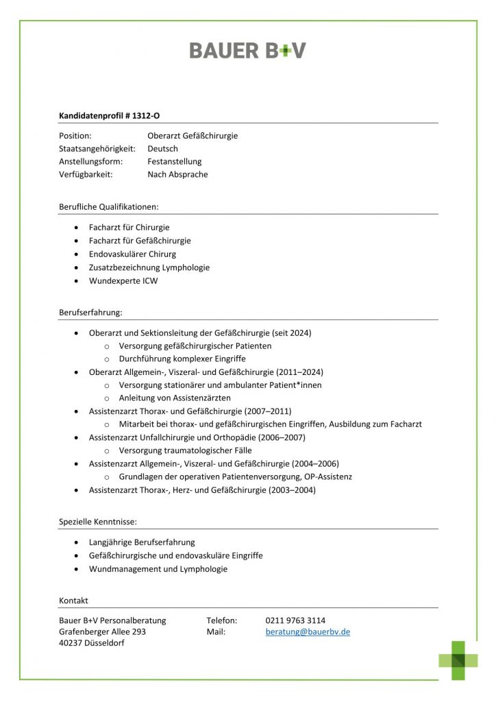 Download - Oberarzt Gefäßchirurgie [# 1312-O] Facharzt für Chirurgie Facharzt für Gefäßchirurgie Endovaskulärer Chirurg Zusatzbezeichnung Lymphologie Wundexperte ICW Oberarzt Sektionsleitung Gefäßchirurgie Versorgung gefäßchirurgischer Patienten Durchführung komplexer Eingriffe Oberarzt Allgemein Viszeral Gefäßchirurgie Versorgung stationärer ambulanter Patientinnen Anleitung Assistenzärzten Assistenzarzt Thorax Gefäßchirurgie Mitarbeit thorax gefäßchirurgischen Eingriffen Ausbildung Facharzt Assistenzarzt Unfallchirurgie Orthopädie Versorgung traumatologischer Fälle Assistenzarzt Allgemein Viszeral Gefäßchirurgie Grundlagen operativen Patientenversorgung OP Assistenz Assistenzarzt Thorax Herz Gefäßchirurgie Langjährige Berufserfahrung Gefäßchirurgische endovaskuläre Eingriffe Wundmanagement Lymphologie