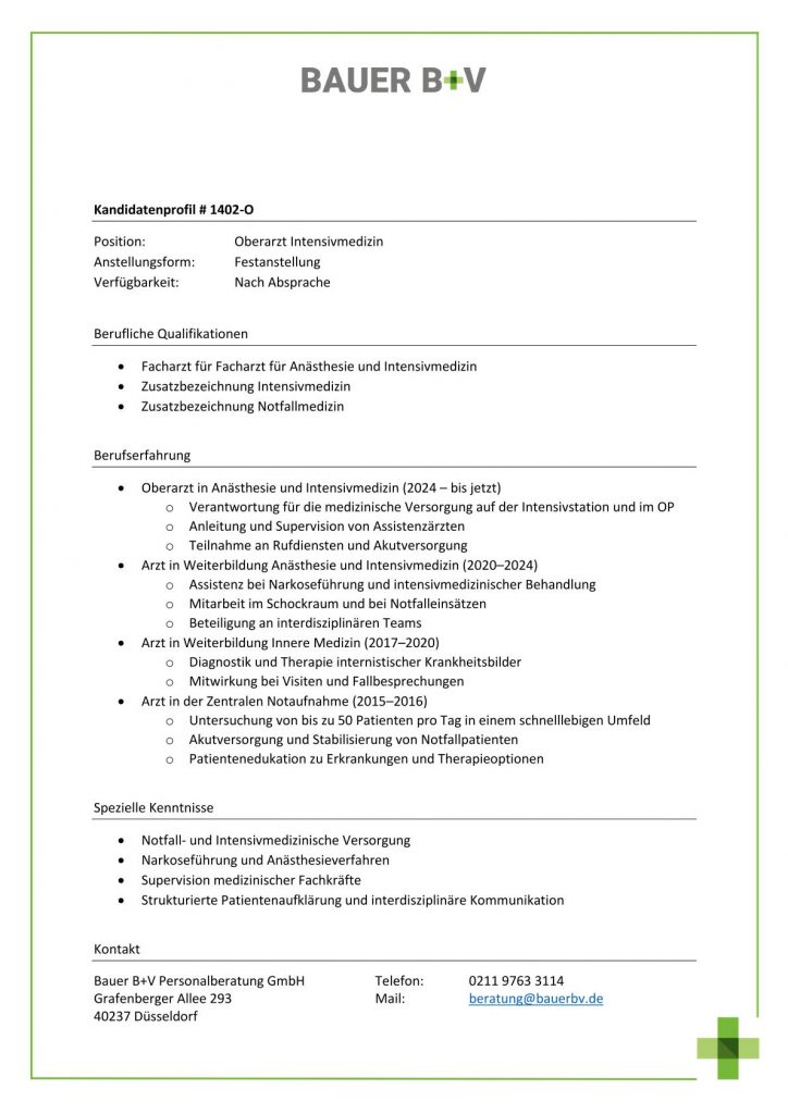 Download - Oberarzt Intensivmedizin [# 1402-O] Facharzt für Facharzt für Anästhesie Intensivmedizin Zusatzbezeichnung Intensivmedizin Zusatzbezeichnung Notfallmedizin Oberarzt in Anästhesie Intensivmedizin Verantwortung für die medizinische Versorgung auf der Intensivstation im OP Anleitung Supervision von Assistenzärzten Teilnahme an Rufdiensten Akutversorgung Arzt in Weiterbildung Anästhesie Intensivmedizin Assistenz bei Narkoseführung intensivmedizinischer Behandlung Mitarbeit im Schockraum bei Notfalleinsätzen Beteiligung an interdisziplinären Teams Arzt in Weiterbildung Innere Medizin Diagnostik Therapie internistischer Krankheitsbilder Mitwirkung bei Visiten Fallbesprechungen Arzt in der Zentralen Notaufnahme Untersuchung von zu Patienten pro Tag in einem schnelllebigen Umfeld Akutversorgung Stabilisierung von Notfallpatienten Patientenedukation zu Erkrankungen Therapieoptionen Notfall Intensivmedizinische Versorgung Narkoseführung Anästhesieverfahren Supervision medizinischer Fachkräfte Strukturierte Patientenaufklärung interdisziplinäre Kommunikation