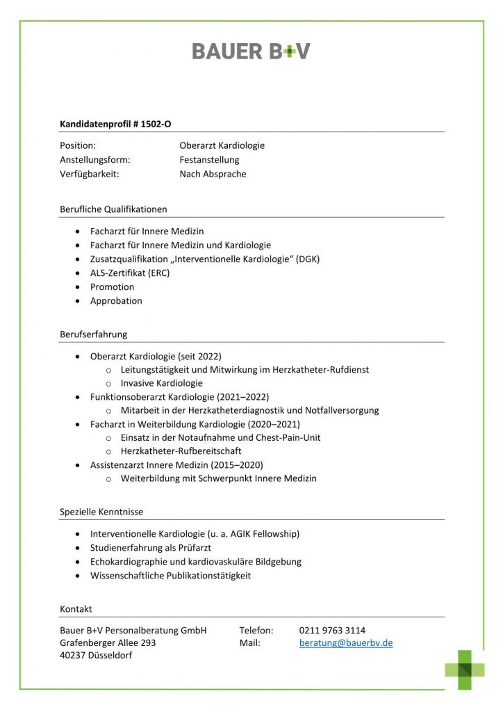 Download - Oberarzt Kardiologie [# 1502-O] Facharzt für Innere Medizin Facharzt für Innere Medizin Kardiologie Zusatzqualifikation Interventionelle Kardiologie DGK ALS Zertifikat ERC Promotion Approbation Oberarzt Kardiologie seit Leitungstätigkeit Mitwirkung im Herzkatheter Rufdienst Invasive Kardiologie Funktionsoberarzt Kardiologie Mitarbeit in der Herzkatheterdiagnostik Notfallversorgung Facharzt in Weiterbildung Kardiologie Einsatz in der Notaufnahme Chest Pain Unit Herzkatheter Rufbereitschaft Assistenzarzt Innere Medizin Weiterbildung mit Schwerpunkt Innere Medizin Interventionelle Kardiologie ua AGIK Fellowship Studienerfahrung Prüfarzt Echokardiographie kardiovaskuläre Bildgebung Wissenschaftliche Publikationstätigkeit