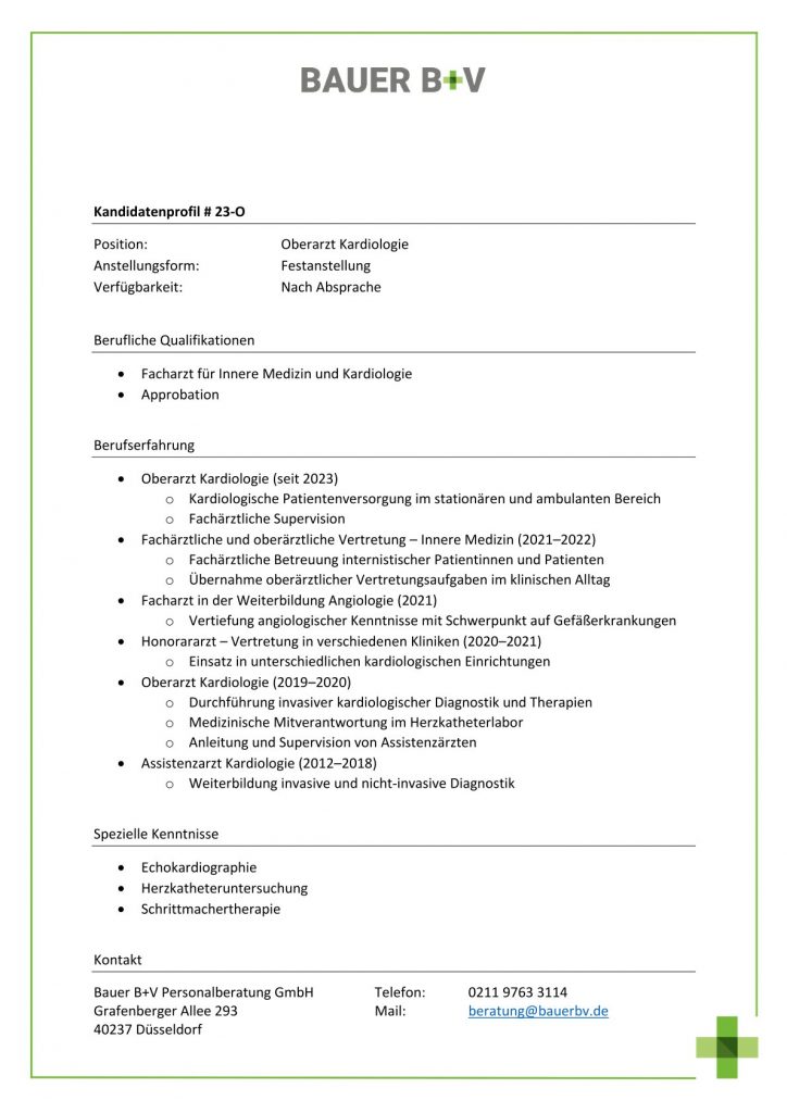 Download - Oberarzt Kardiologie [# 23-O] Facharzt für Innere Medizin Kardiologie Approbation Oberarzt Kardiologie seit Kardiologische Patientenversorgung im stationären ambulanten Bereich Fachärztliche Supervision Fachärztliche oberärztliche Vertretung Innere Medizin Fachärztliche Betreuung internistischer Patientinnen Patienten Übernahme oberärztlicher Vertretungsaufgaben im klinischen Alltag Facharzt in der Weiterbildung Angiologie Vertiefung angiologischer Kenntnisse mit Schwerpunkt auf Gefäßerkrankungen Honorararzt Vertretung in verschiedenen Kliniken Einsatz in unterschiedlichen kardiologischen Einrichtungen Oberarzt Kardiologie Durchführung invasiver kardiologischer Diagnostik Therapien Medizinische Mitverantwortung im Herzkatheterlabor Anleitung Supervision von Assistenzärzten Assistenzarzt Kardiologie Weiterbildung invasive nicht invasive Diagnostik Echokardiographie Herzkatheteruntersuchung Schrittmachertherapie