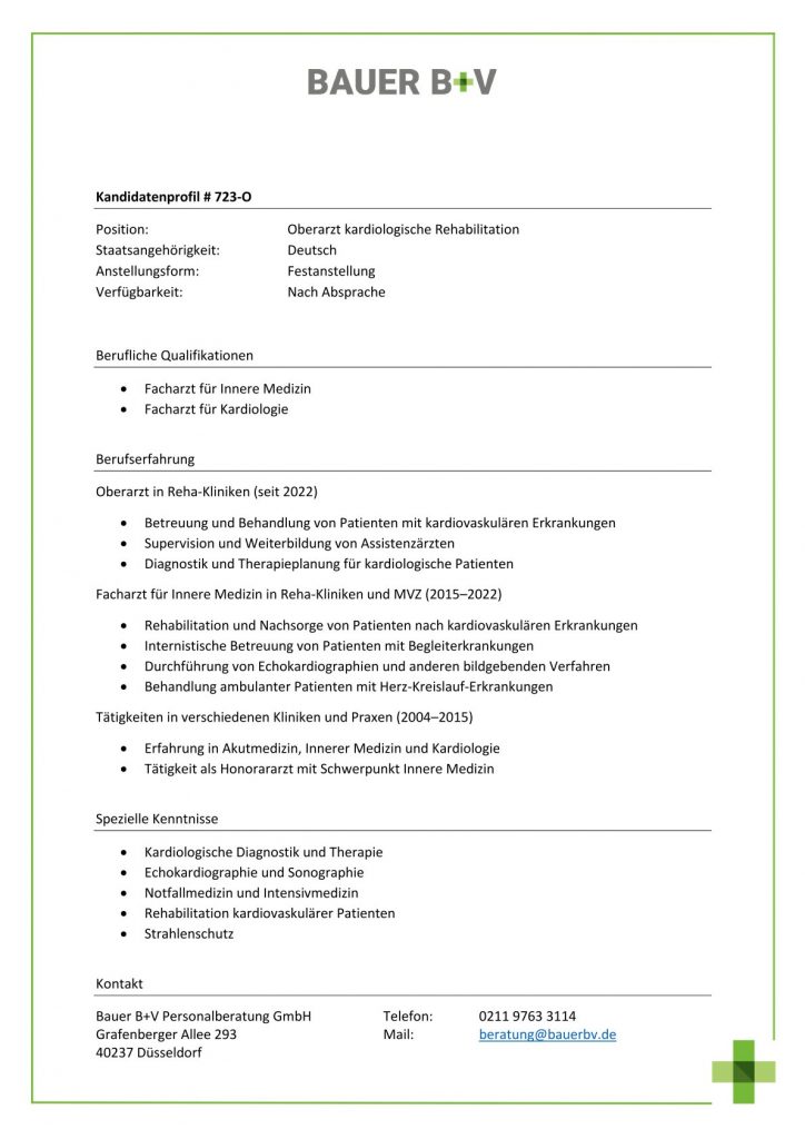 Download - Oberarzt kardiologische Rehabilitation [# 723-O] Facharzt für Innere Medizin Facharzt für Kardiologie Oberarzt in Reha Kliniken Betreuung Behandlung von Patienten mit kardiovaskulären Erkrankungen Supervision Weiterbildung von Assistenzärzten Diagnostik Therapieplanung für kardiologische Patienten Facharzt für Innere Medizin in Reha Kliniken MVZ Rehabilitation Nachsorge von Patienten nach kardiovaskulären Erkrankungen Internistische Betreuung von Patienten mit Begleiterkrankungen Durchführung von Echokardiographien anderen bildgebenden Verfahren Behandlung ambulanter Patienten mit Herz Kreislauf Erkrankungen Tätigkeiten in verschiedenen Kliniken Praxen Erfahrung in Akutmedizin Innerer Medizin Kardiologie Tätigkeit als Honorararzt mit Schwerpunkt Innere Medizin Kardiologische Diagnostik Therapie Echokardiographie Sonographie Notfallmedizin Intensivmedizin Rehabilitation kardiovaskulärer Patienten Strahlenschutz