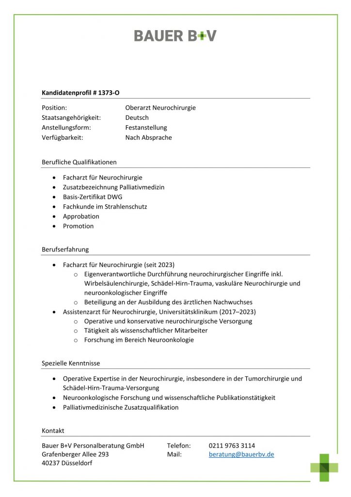 Download - Oberarzt Neurochirurgie [# 1373-O] Facharzt für Neurochirurgie Zusatzbezeichnung Palliativmedizin BasisZertifikat DWG Fachkunde im Strahlenschutz Approbation Promotion Facharzt für Neurochirurgie Eigenverantwortliche Durchführung neurochirurgischer Eingriffe inkl Wirbelsäulenchirurgie SchädelHirnTrauma vaskuläre Neurochirurgie neuroonkologischer Eingriffe Beteiligung an der Ausbildung des ärztlichen Nachwuchses Assistenzarzt für Neurochirurgie Universitätsklinikum Operative konservative neurochirurgische Versorgung Tätigkeit wissenschaftlicher Mitarbeiter Forschung im Bereich Neuroonkologie Operative Expertise in der Neurochirurgie insbesondere in der Tumorchirurgie SchädelHirnTraumaVersorgung Neuroonkologische Forschung wissenschaftliche Publikationstätigkeit Palliativmedizinische Zusatzqualifikation