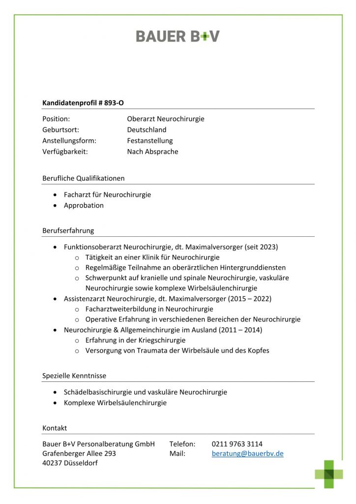 Download - Oberarzt Neurochirurgie [# 893-O] Facharzt Neurochirurgie Approbation Funktionsoberarzt Neurochirurgie Tätigkeit Klinik Neurochirurgie Regelmäßige Teilnahme oberärztlichen Hintergrunddiensten Schwerpunkt kranielle spinale Neurochirurgie vaskuläre Neurochirurgie komplexe Wirbelsäulenchirurgie Assistenzarzt Neurochirurgie Facharztweiterbildung Neurochirurgie Operative Erfahrung verschiedenen Bereichen Neurochirurgie Neurochirurgie Allgemeinchirurgie Ausland Erfahrung Kriegschirurgie Versorgung Traumata Wirbelsäule Kopf Schädelbasischirurgie vaskuläre Neurochirurgie Komplexe Wirbelsäulenchirurgie