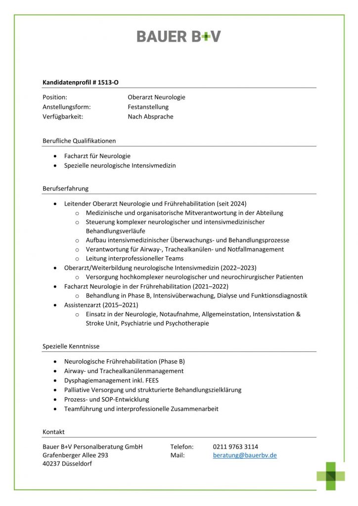 Download - Oberarzt Neurologie [# 1513-O] Facharzt für Neurologie Spezielle neurologische Intensivmedizin Leitender Oberarzt Neurologie Frührehabilitation seit Medizinische organisatorische Mitverantwortung in der Abteilung Steuerung komplexer neurologischer intensivmedizinischer Behandlungsverläufe Aufbau intensivmedizinischer Überwachungs Behandlungsprozesse Verantwortung für Airway Trachealkanülen Notfallmanagement Leitung interprofessioneller Teams OberarztWeiterbildung neurologische Intensivmedizin Versorgung hochkomplexer neurologischer neurochirurgischer Patienten Facharzt Neurologie in der Frührehabilitation Behandlung in Phase B Intensivüberwachung Dialyse Funktionsdiagnostik Assistenzarzt Einsatz in der Neurologie Notaufnahme Allgemeinstation Intensivstation Stroke Unit Psychiatrie Psychotherapie Neurologische Frührehabilitation Phase B Airway Trachealkanülenmanagement Dysphagiemanagement inkl FEES Palliative Versorgung strukturierte Behandlungszielklärung Prozess SOPEntwicklung Teamführung interprofessionelle Zusammenarbeit