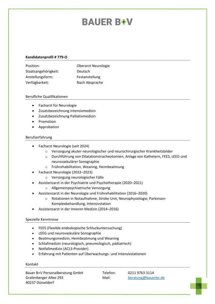 Download - Oberarzt Neurologie [# 779-O] Facharzt für Neurologie Zusatzbezeichnung Intensivmedizin Zusatzbezeichnung Palliativmedizin Promotion Approbation Facharzt Neurologie Versorgung akuter neurologischer neurochirurgischer Krankheitsbilder Durchführung von Dilatationstracheotomien Anlage von Kathetern FEES cEEG neurovaskulärer Sonographie Frührehabilitation Weaning Heimbeatmung Facharzt Neurologie Versorgung neurologischer Fälle Assistenzarzt in der Psychiatrie Psychotherapie Allgemeinpsychiatrische Versorgung Assistenzarzt in der Neurologie Frührehabilitation Rotationen in Notaufnahme Stroke Unit Neurophysiologie ParkinsonKomplexbehandlung Intensivstation Assistenzarzt in der Inneren Medizin FEES Flexible endoskopische Schluckuntersuchung cEEG neurovaskuläre Sonographie Beatmungsmedizin Heimbeatmung Weaning Schlafmedizin neurologisch pneumologisch pädiatrisch Notfallmedizin ACLSProvider Erfahrung mit Patienten auf Überwachungs Intensivstationen