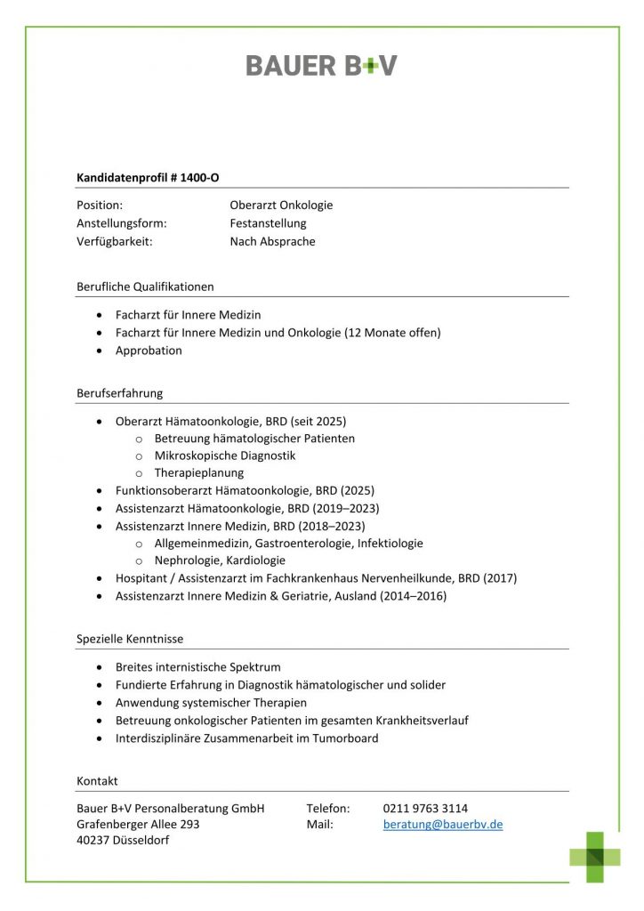 Download - Oberarzt Onkologie [# 1400-O] Facharzt für Innere Medizin Facharzt für Innere Medizin Onkologie Approbation Oberarzt Hämatoonkologie BRD seit Betreuung hämatologischer Patienten Mikroskopische Diagnostik Therapieplanung Funktionsoberarzt Hämatoonkologie BRD Assistenzarzt Hämatoonkologie BRD Assistenzarzt Innere Medizin BRD Allgemeinmedizin Gastroenterologie Infektiologie Nephrologie Kardiologie Hospitant Assistenzarzt im Fachkrankenhaus Nervenheilkunde BRD Assistenzarzt Innere Medizin Geriatrie Ausland Breites internistische Spektrum Fundierte Erfahrung in Diagnostik hämatologischer solider Anwendung systemischer Therapien Betreuung onkologischer Patienten im gesamten Krankheitsverlauf Interdisziplinäre Zusammenarbeit im Tumorboard