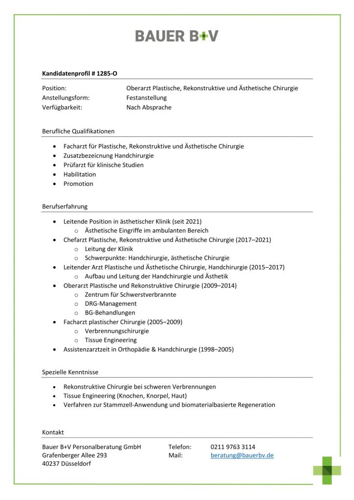 Download - Oberarzt Plastische, Rekonstruktive und Ästhetische Chirurgie [# 1285-O] Facharzt für Plastische Rekonstruktive Ästhetische Chirurgie Zusatzbezeicnung Handchirurgie Prüfarzt für klinische Studien Habilitation Promotion Leitende Position in ästhetischer Klinik Ästhetische Eingriffe im ambulanten Bereich Chefarzt Plastische Rekonstruktive Ästhetische Chirurgie Leitung der Klinik Schwerpunkte Handchirurgie ästhetische Chirurgie Leitender Arzt Plastische Ästhetische Chirurgie Handchirurgie Aufbau Leitung der Handchirurgie Ästhetik Oberarzt Plastische Rekonstruktive Chirurgie Zentrum für Schwerstverbrannte DRGManagement BGBehandlungen Facharzt plastischer Chirurgie Verbrennungschirurgie Tissue Engineering Assistenzarztzeit in Orthopädie Handchirurgie Rekonstruktive Chirurgie bei schweren Verbrennungen Tissue Engineering Knochen Knorpel Haut Verfahren zur StammzellAnwendung biomaterialbasierte Regeneration