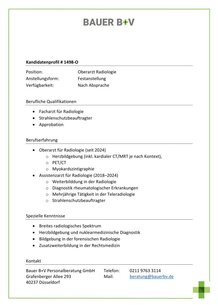 Download - Oberarzt Radiologie [# 1498-O] Facharzt für Radiologie Strahlenschutzbeauftragter Approbation Oberarzt für Radiologie seit Herzbildgebung inkl kardialer CT MRT je nach Kontext PETCT Myokardszintigraphie Assistenzarzt für Radiologie Weiterbilddung in der Radiologie Diagnostik rheumatologischer Erkrankungen Mehrjährige Tätigkeit in der Teleradiologie Strahlenschutzbeauftragter Breites radiologisches Spektrum Herzbildgebung nuklearmedizinische Diagnostik Bildgebung in der forensischen Radiologie Zusatzweiterbildung in der Rechtsmedizin