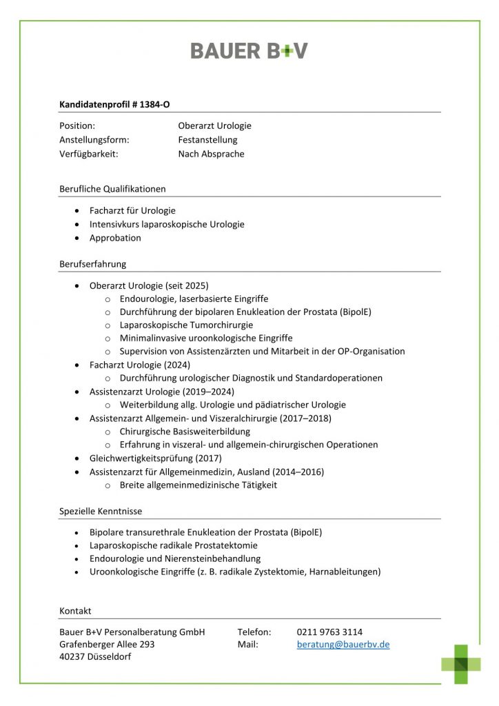 Download - Oberarzt Urologie [# 1384-O] Facharzt für Urologie Intensivkurs laparoskopische Urologie Approbation Oberarzt Urologie seit Endourologie laserbasierte Eingriffe Durchführung der bipolaren Enukleation der Prostata BipolE Laparoskopische Tumorchirurgie Minimalinvasive uroonkologische Eingriffe Supervision von Assistenzärzten Mitarbeit in der OP Organisation Facharzt Urologie Durchführung urologischer Diagnostik Standardoperationen Assistenzarzt Urologie Weiterbildung allg Urologie pädiatrischer Urologie Assistenzarzt Allgemein Viszeralchirurgie Chirurgische Basisweiterbildung Erfahrung in viszeral allgemein chirurgischen Operationen Gleichwertigkeitsprüfung Assistenzarzt für Allgemeinmedizin Ausland Breite allgemeinmedizinische Tätigkeit Bipolare transurethrale Enukleation der Prostata BipolE Laparoskopische radikale Prostatektomie Endourologie Nierensteinbehandlung Uroonkologische Eingriffe z B radikale Zystektomie Harnableitungen