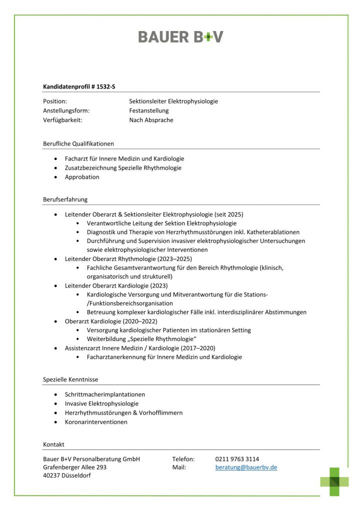 Download - Sektionsleiter Elektrophysiologie [# 1532-S] Facharzt für Innere Medizin Kardiologie Zusatzbezeichnung Spezielle Rhythmologie Approbation Leitender Oberarzt Sektionsleiter Elektrophysiologie seit Verantwortliche Leitung der Sektion Elektrophysiologie Diagnostik Therapie von Herzrhythmusstörungen inkl Katheterablationen Durchführung Supervision invasiver elektrophysiologischer Untersuchungen elektrophysiologischer Interventionen Leitender Oberarzt Rhythmologie Fachliche Gesamtverantwortung für den Bereich Rhythmologie klinisch organisatorisch strukturell Leitender Oberarzt Kardiologie Kardiologische Versorgung Mitverantwortung für die Stations Funktionsbereichsorganisation Betreuung komplexer kardiologischer Fälle inkl interdisziplinärer Abstimmungen Oberarzt Kardiologie Versorgung kardiologischer Patienten im stationären Setting Weiterbildung Spezielle Rhythmologie Assistenzarzt Innere Medizin Kardiologie Facharztanerkennung für Innere Medizin Kardiologie Schrittmacherimplantationen Invasive Elektrophysiologie Herzrhythmusstörungen Vorhofflimmern Koronarinterventionen