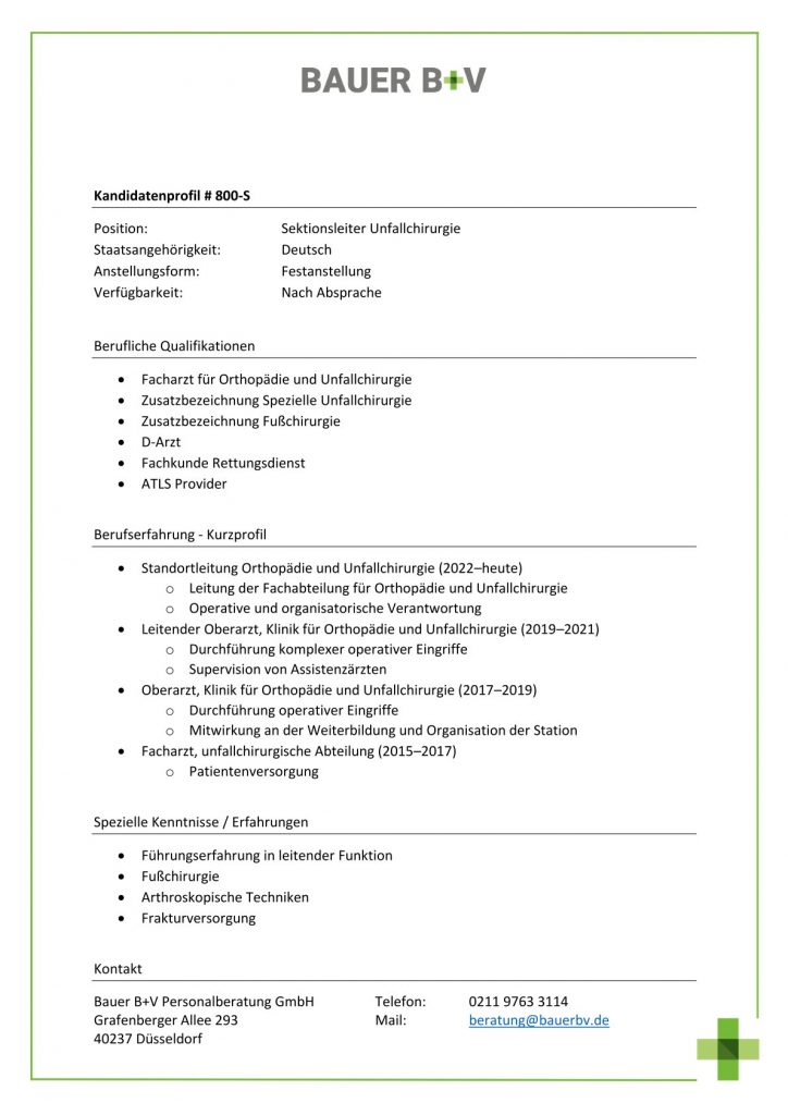Download - Sektionsleiter Unfallchirurgie [# 800-S] Facharzt Orthopädie Unfallchirurgie Zusatzbezeichnung Spezielle Unfallchirurgie Zusatzbezeichnung Fußchirurgie Arzt Fachkunde Rettungsdienst ATLS Provider Standortleitung Orthopädie Unfallchirurgie Leitung Fachabteilung Orthopädie Unfallchirurgie Operative organisatorische Verantwortung Leitender Oberarzt Klinik Orthopädie Unfallchirurgie Durchführung komplexer operativer Eingriffe Supervision Assistenzärzten Oberarzt Klinik Orthopädie Unfallchirurgie Durchführung operativer Eingriffe Mitwirkung Weiterbildung Organisation Station Facharzt unfallchirurgische Abteilung Patientenversorgung Führungserfahrung leitender Funktion Fußchirurgie Arthroskopische Techniken Frakturversorgung